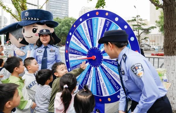 图为民警通过趣味转盘向市南区悦府幼儿园小朋友普及日常食品安全知识