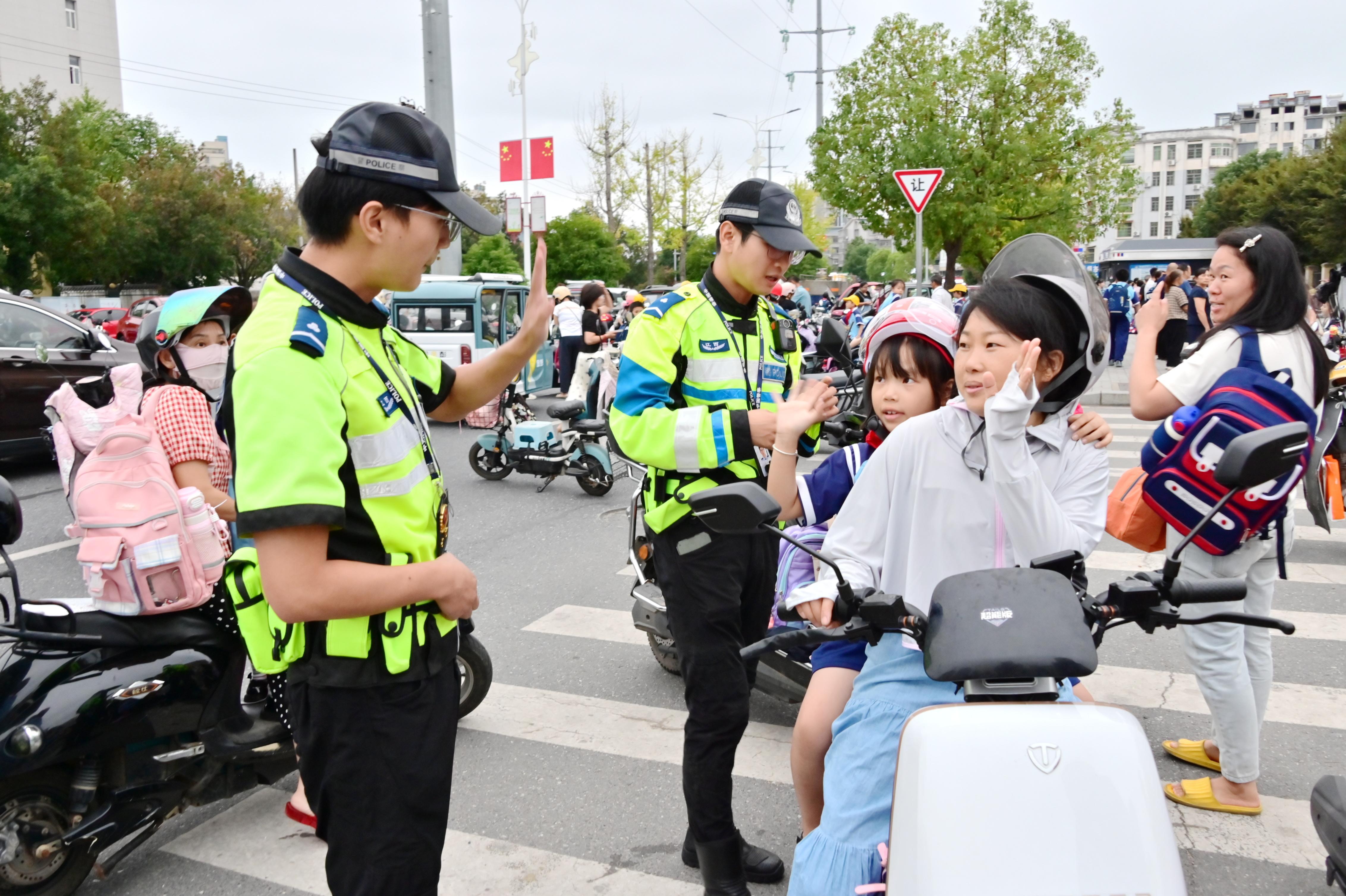图为10月13日,武宁交警“铁骑”队员在武宁县第四小学开展文明交通劝导活动。
