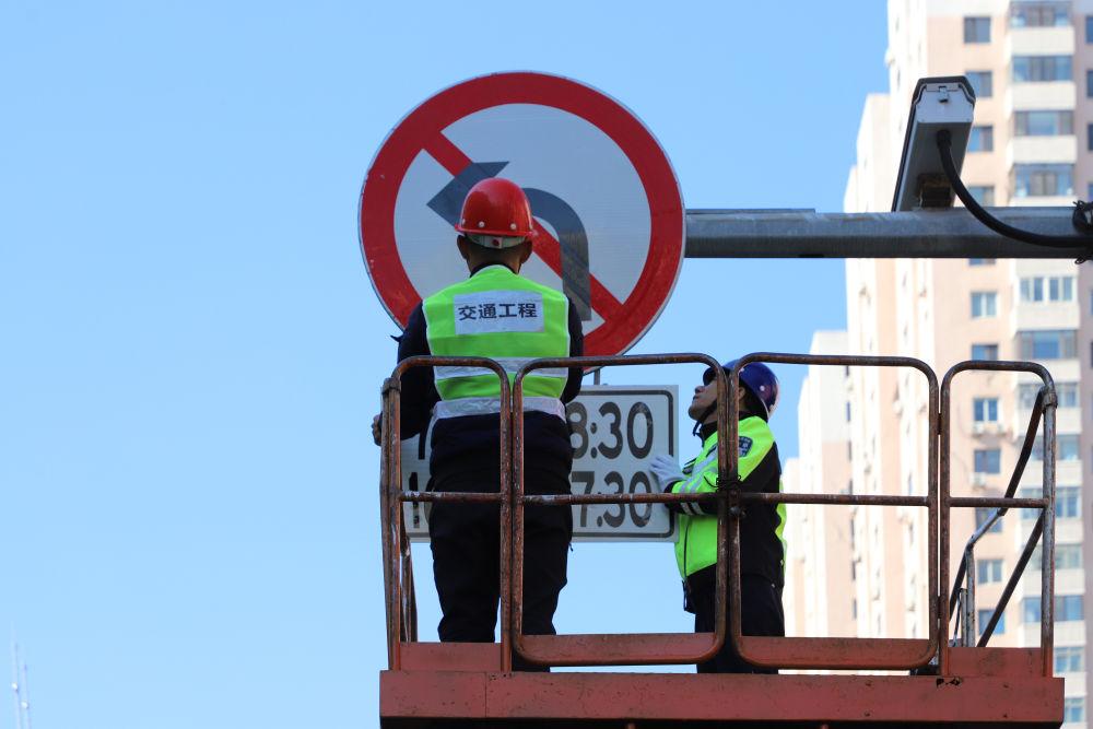 图为本溪交警联合相关部门对指示牌进行安装检查。