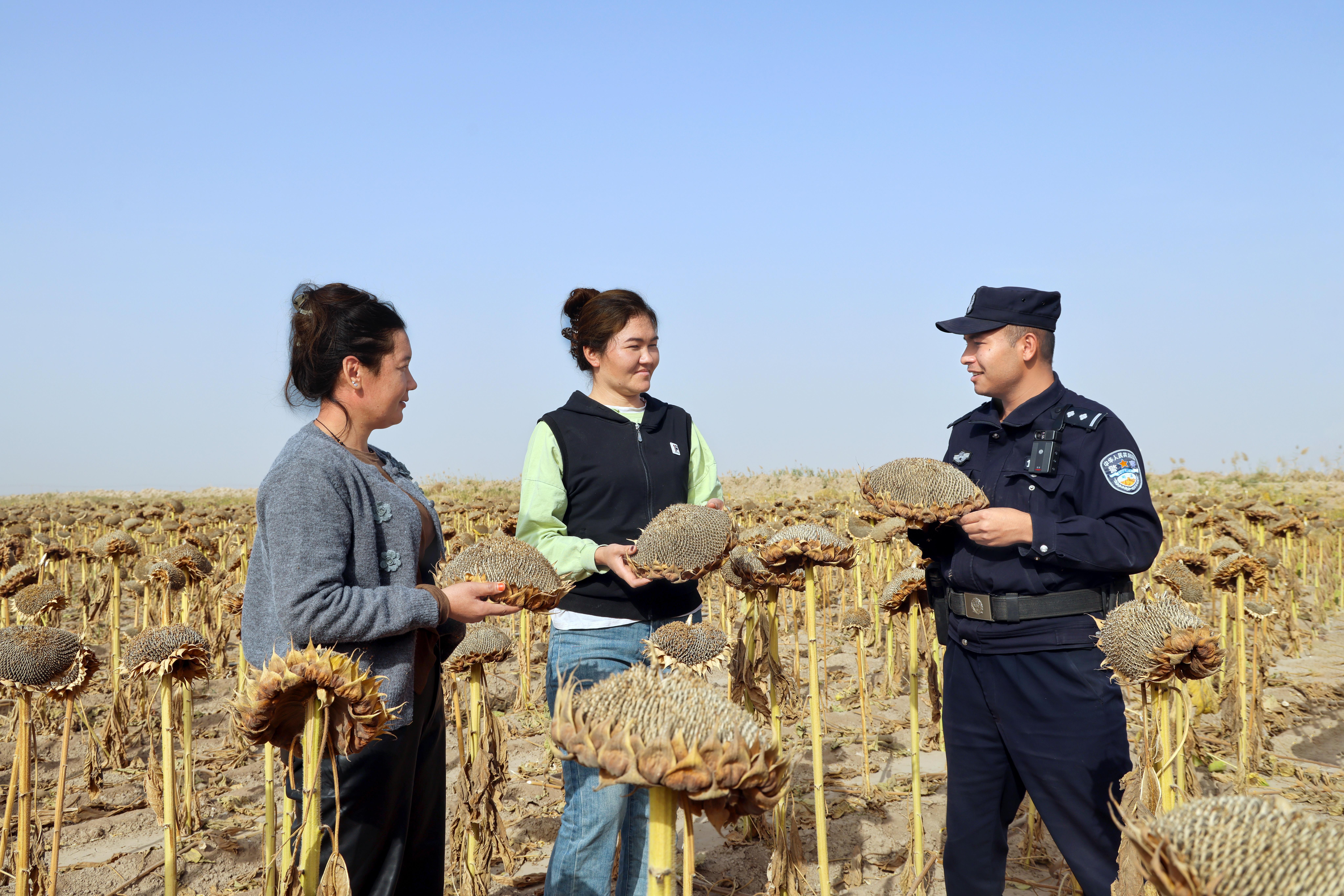 10月29日,新疆巴楚县万亩食葵迎来采收高峰。在恰尔巴格乡库木加依村的田间地头,连片的食葵垂下饱满的花盘,收割机的轰鸣声与人们的欢笑声此起彼伏,处处洋溢着丰收的喜悦。在这片金黄画卷中,一群身着藏蓝警服的身影格外醒目——巴楚县公安局成立的“秋收服务队”的民辅警正忙碌其间,他们不仅助力采收解民忧,更将反诈知识带到生产一线,实现“秋收+反诈”的双赢局面。