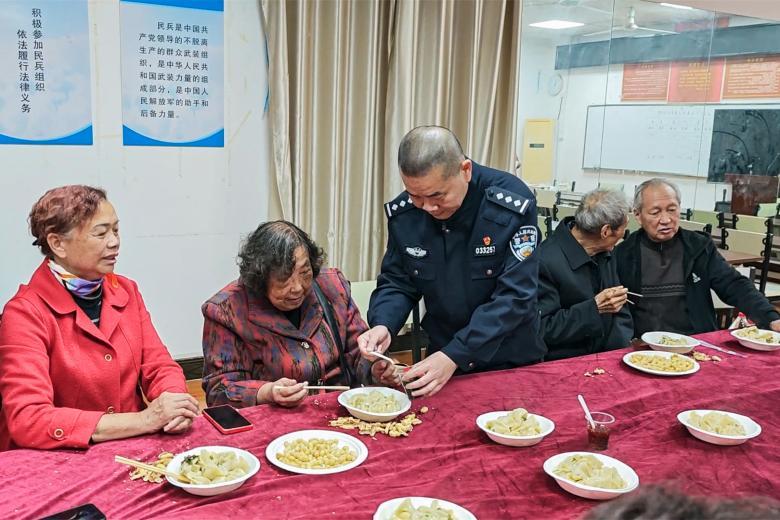 图为邵奇(中)在重阳节前夕为辖区独居老人办饺子宴。
