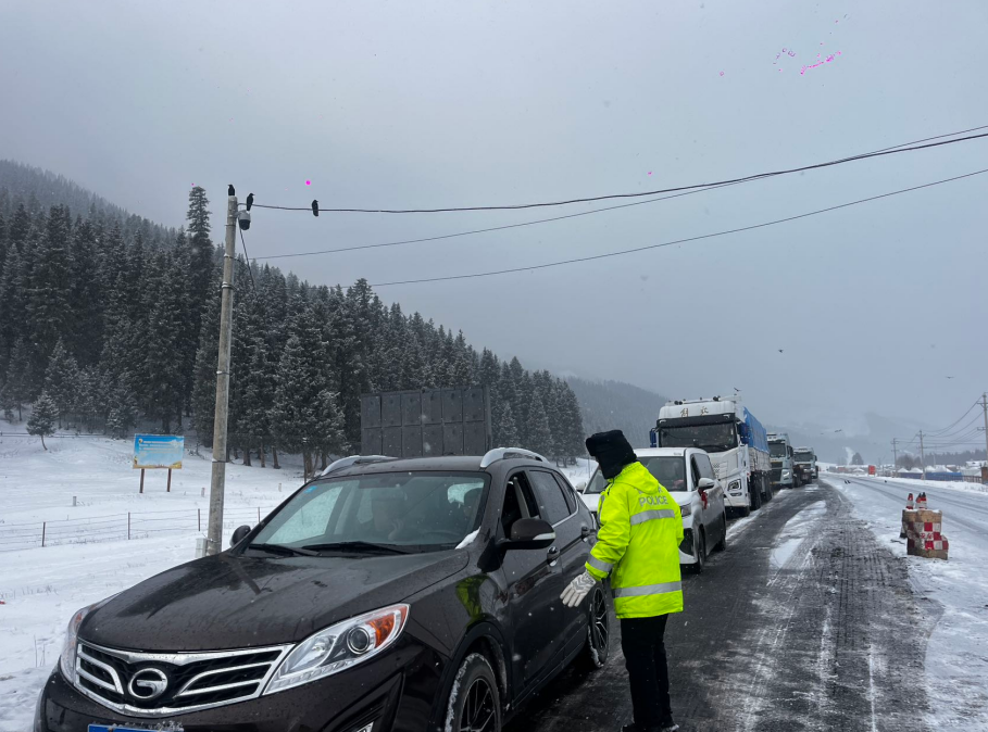 11月22日,新疆和静县山区道路迎来降雪天气,部分道路积雪结冰,给群众出行和道路交通安全带来风险挑战。和静县公安局交通管理大队迅速启动恶劣天气交通管理应急预案,全警动员、科学部署,全力保障辖区道路交通安全畅通,守护群众出行平安。交警在辖区重点路段、重点时段增派警力,采取固定执勤和巡逻执勤相结合的方式,指挥疏导过往车辆和行人有序通行,全力保障群众出行安全。