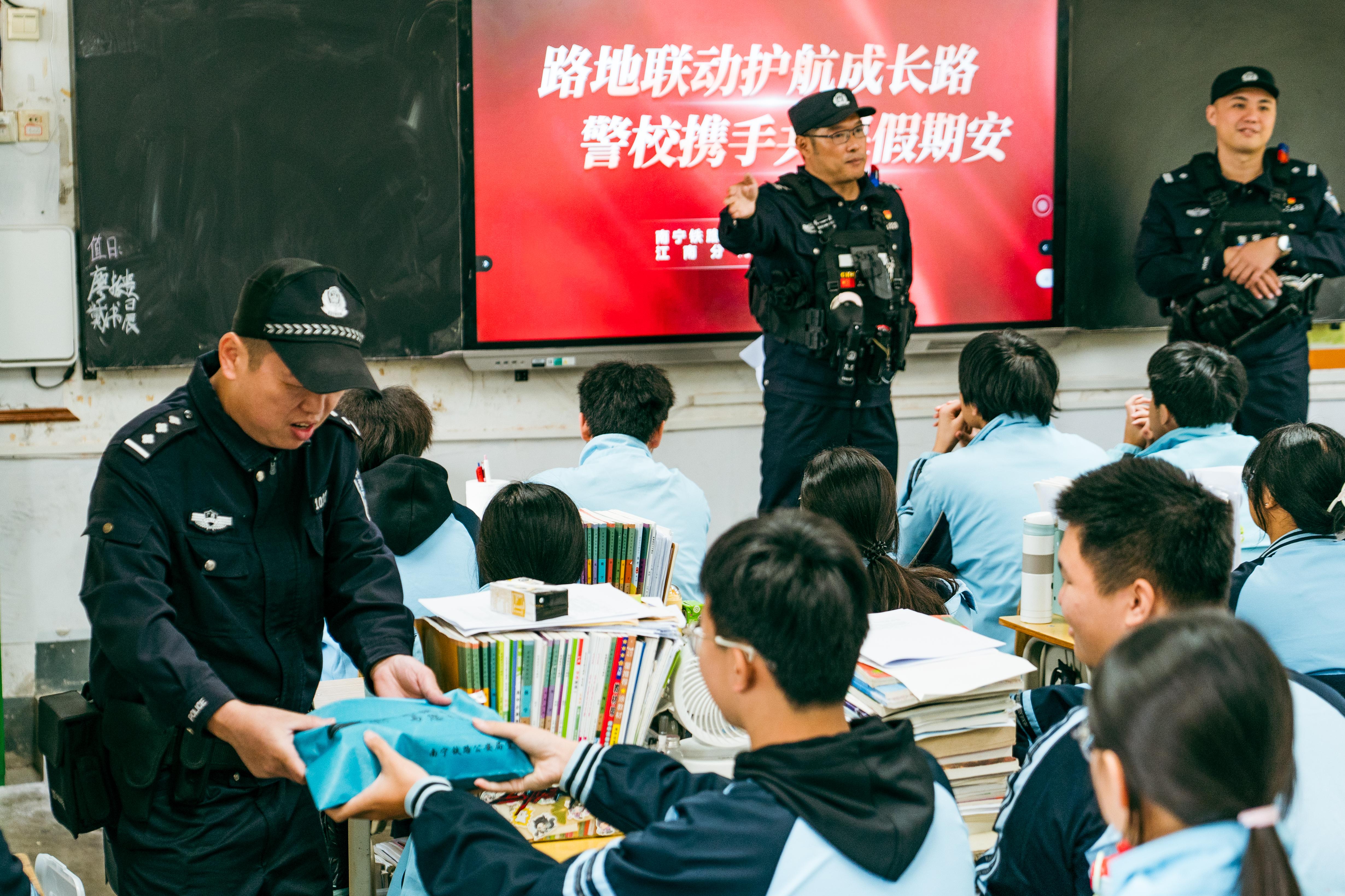 近日,南宁铁路公安局南宁公安处南宁南站派出所联合南宁市公安局,走进南宁市江西中学开展“护航成长路”安全教育活动。活动中,民警通过现场讲解、互动问答等形式,向学生普及铁路安全、防诈骗等知识,进一步增强青少年安全意识,筑牢假期安全防线。