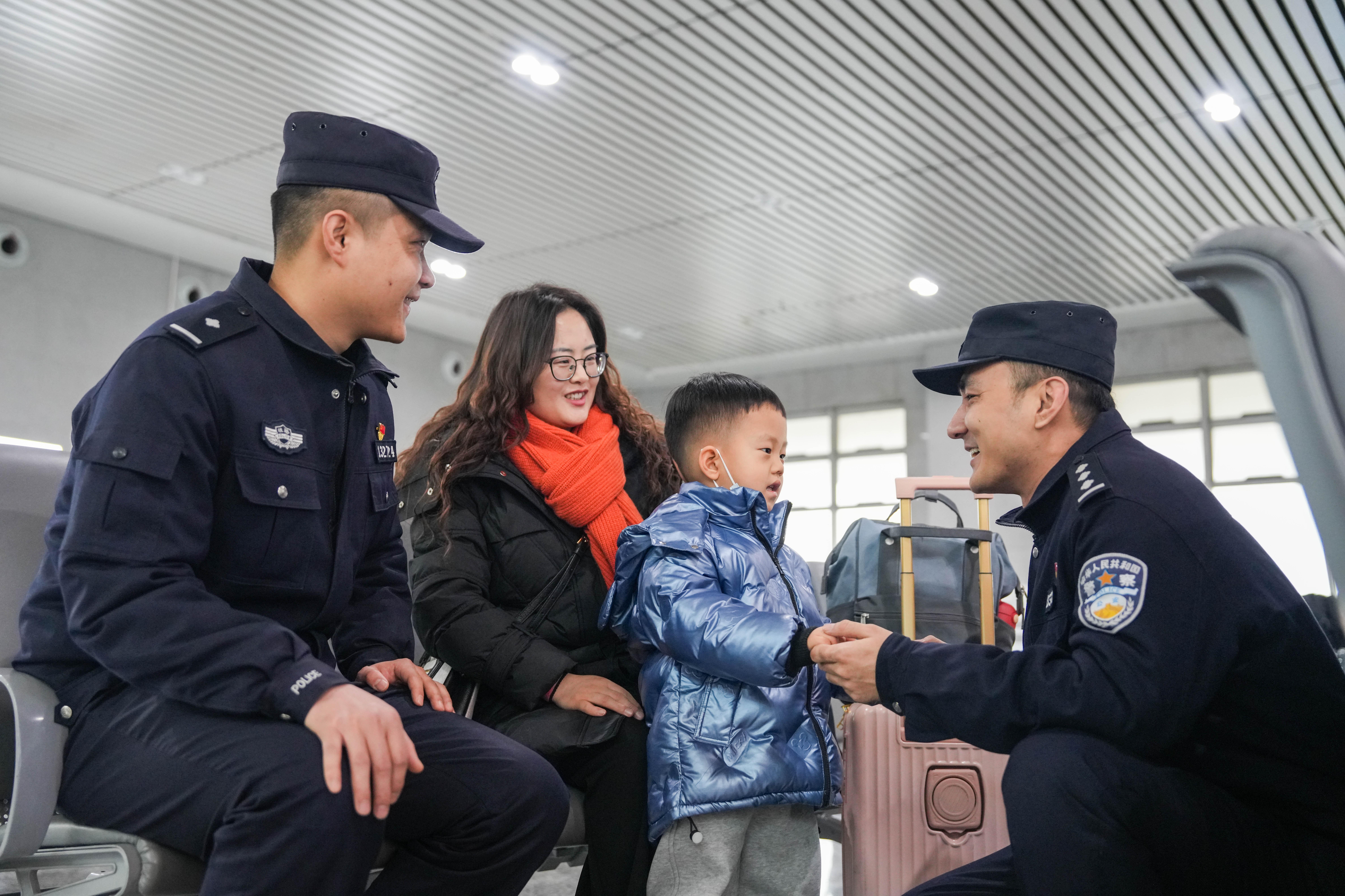 图为1月30日,乌鲁木齐铁路公安局哈密公安处“春运蜜警”服务小分队民警在哈密站候车室向旅客开展出行安全提示,与旅客群众开展暖心互动,并赠送纪念品。