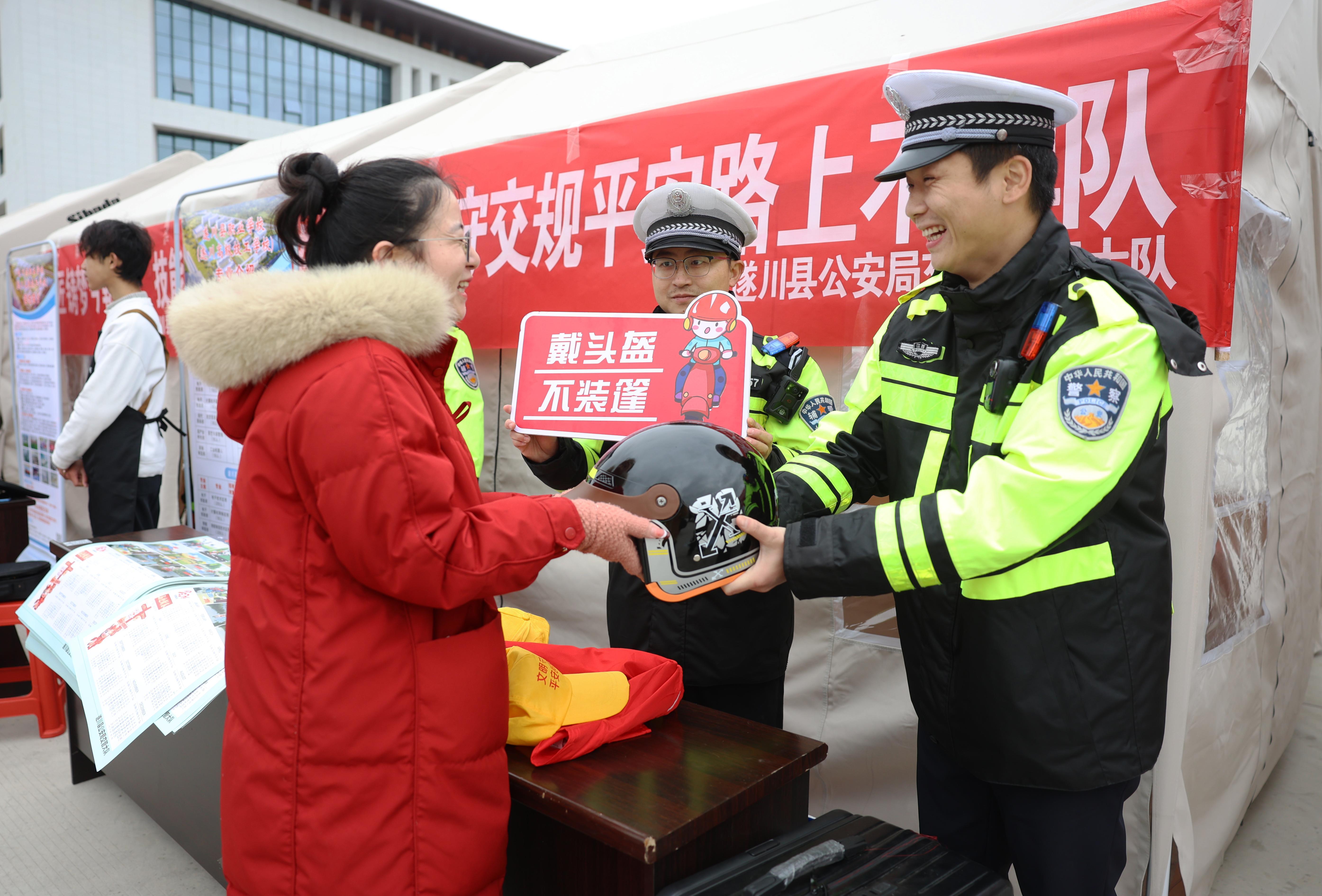 2026年春运首日,江西省遂川县公安局交管大队联合多部门在县文化产业中心广场举办“我们的节日·春运”平安交通贺新春活动,民辅警与志愿者通过方言顺口溜、拍手歌等形式,向群众宣讲道路交通安全法律知识,并设置知识抢答环节,为参与群众赠送安全头盔。