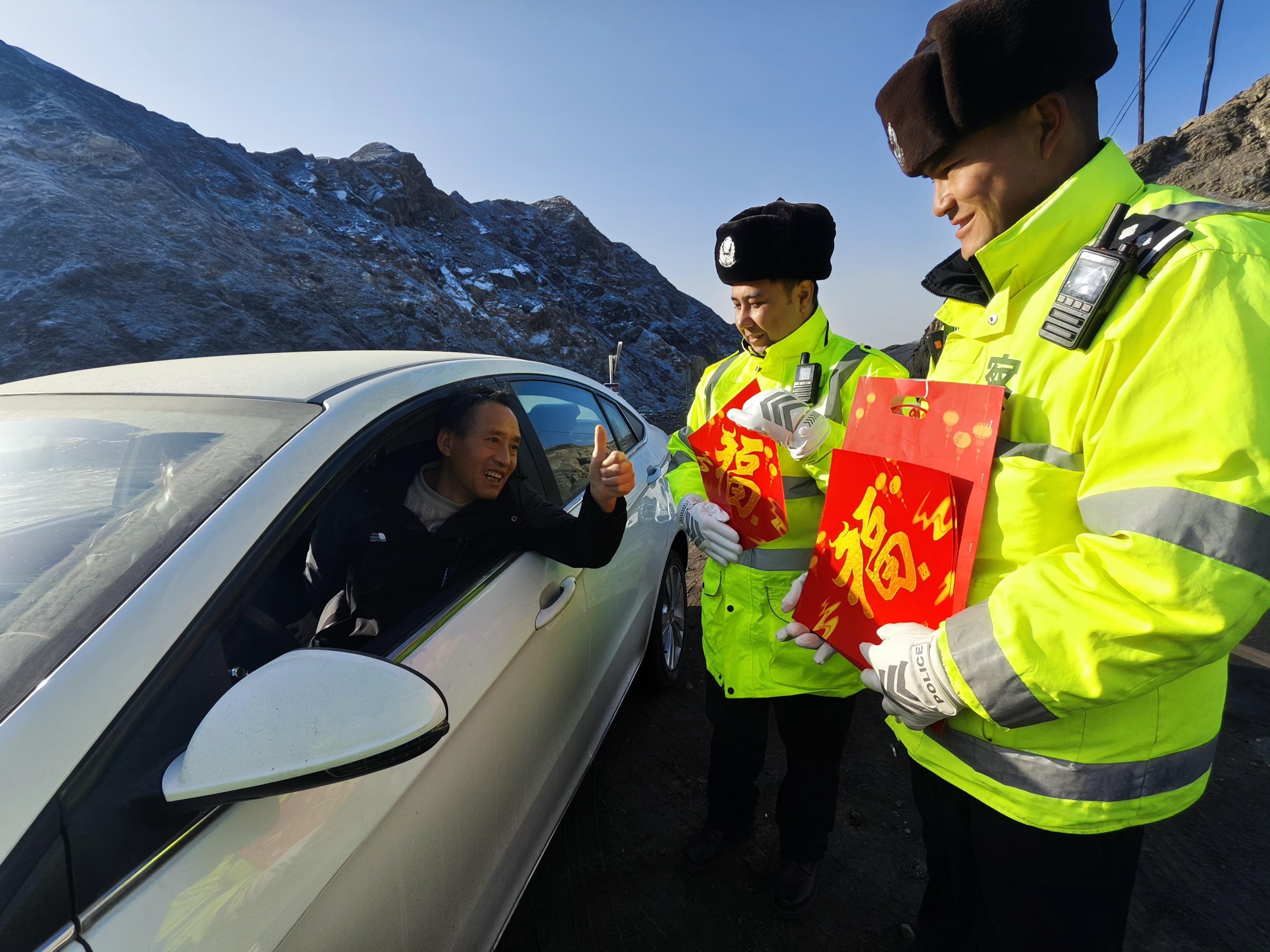 新疆库尔勒:交警送上“平安福”温暖春运“回家路”