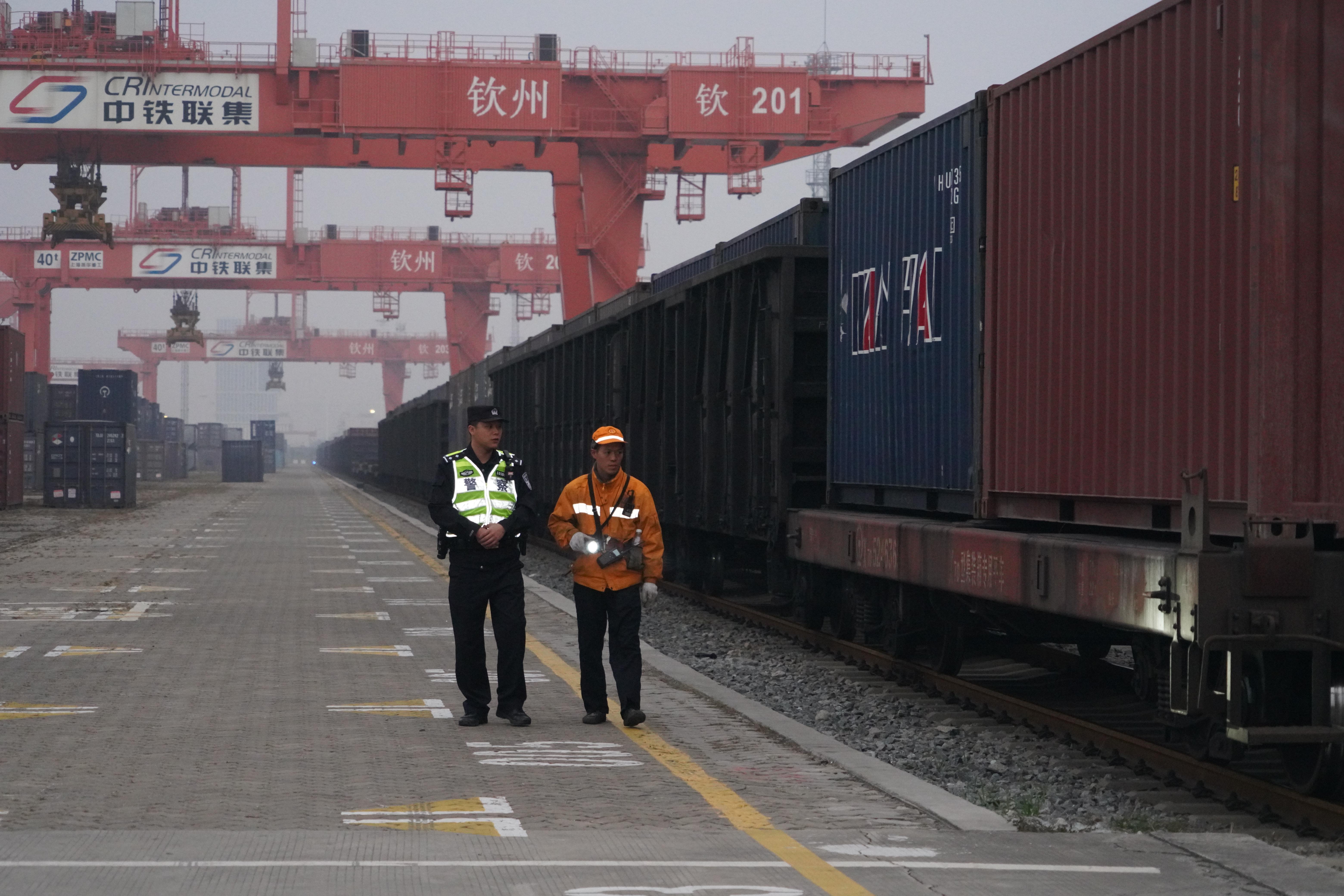 图为李浩伟和铁路职工检查货场。陈大鹏 摄