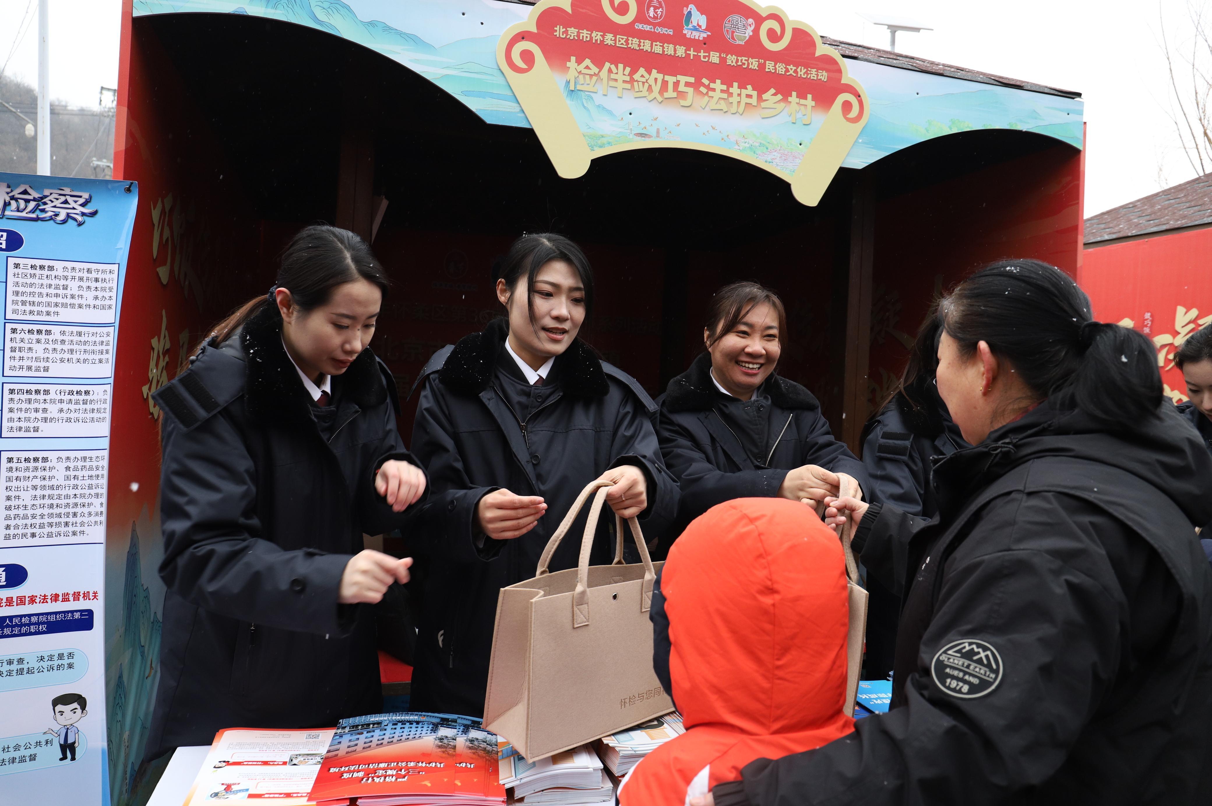 3月4日,在北京市怀柔区琉璃庙镇第十七届“敛巧饭”民俗文化活动现场,怀柔区人民检察院以“非遗+法治”为主题开展法治宣传,通过线上直播、线下互动、咨询服务相结合,把法治课堂搬进民俗盛会。