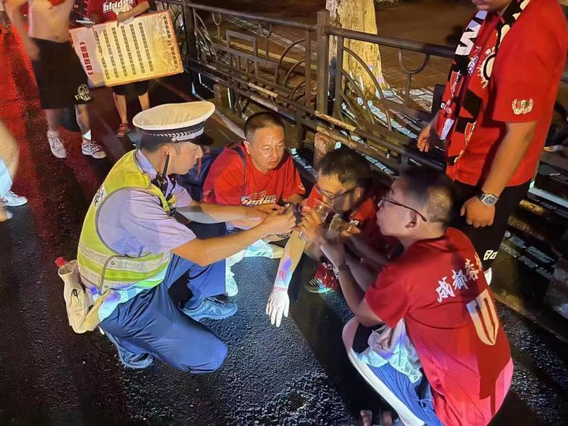 当晚23时20分许,比赛结束后,乐山市公安局交警支队直属一大队牛咡桥中队交警马涛和王飞仍坚守在市中区新广场执勤点巡逻执勤,发现一名刚刚从摆渡车上下来的球迷突然摔倒在地。