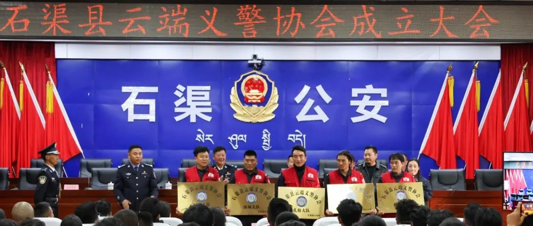 心有义,皆为警!为进一步破解警力局限,壮大发展基层群防群治力量,不断探索共建、共治、共享的基层社会治理新格局。9月21日,四川省甘孜州首个“云端义警协会”在海拔4200米的石渠县正式揭牌成立。成立大会上,主持人宣布了云端义警协会第一届理事会选举结果和《石渠县民政局关于同意成立云端义警协会的批复》;与会代表观看学习了内地义警工作经验交流微视频;新当选的云端义警协会会长做了表态发言,并为云端义警协会及下属各片区大队和中队代表授旗、授牌。