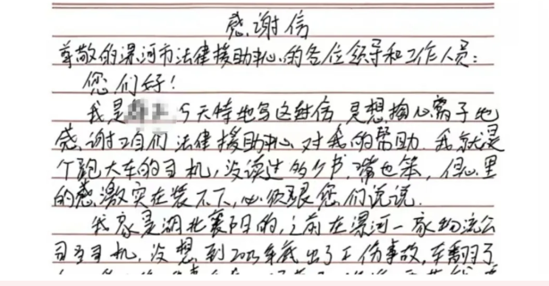 “感谢漯河的法律援助,让我在异乡受伤后,还能感受到这样的温暖……”2025年8月的一个上午,河南省漯河市法律援助中心办公室里,一面鲜红的锦旗旁,静静放着一封湖北寄出的手写来信,满溢着货车司机薛某的感谢之意,也由此串联起一段暖心的法援故事。