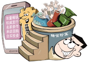 让普通的流水线作业、批量生产的大路货、地摊货,摇身变成大师之作、稀缺限量的“藏品”,到这里还不算完,在销售环节还会有一系列令人眼花缭乱的操作,对作者进行虚假包装,对“藏品”的收藏价值、升值空间进行虚构等。