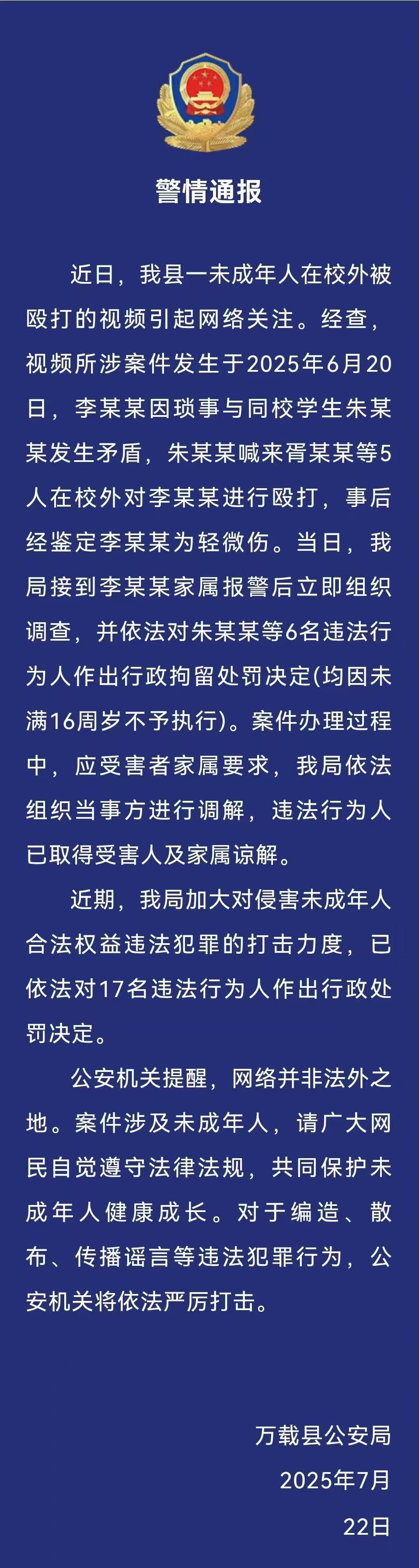 近日,我县一未成年人在校外被殴打的视频引起网络关注。经查,视频所涉案件发生于2025年6月20日,李某某因琐事与同校学生朱某某发生矛盾,朱某某喊来胥某某等5人在校外对李某某进行殴打,事后经鉴定李某某为轻微伤。当日,我局接到李某某家属报警后立即组织调查,并依法对朱某某等6名违法行为人作出行政拘留处罚决定(均因未满16周岁不予执行)。案件办理过程中,应受害者家属要求,我局依法组织当事方进行调解,违法行为人已取得受害人及家属谅解。