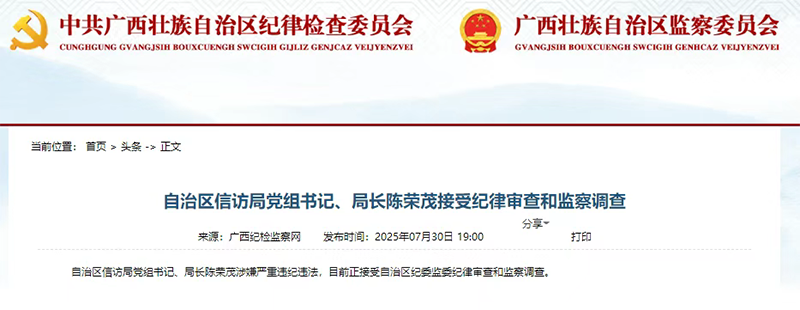 广西纪检监察网7月30日下午发布消息:自治区信访局党组书记、局长陈荣茂涉嫌严重违纪违法,目前正接受自治区纪委监委纪律审查和监察调查。