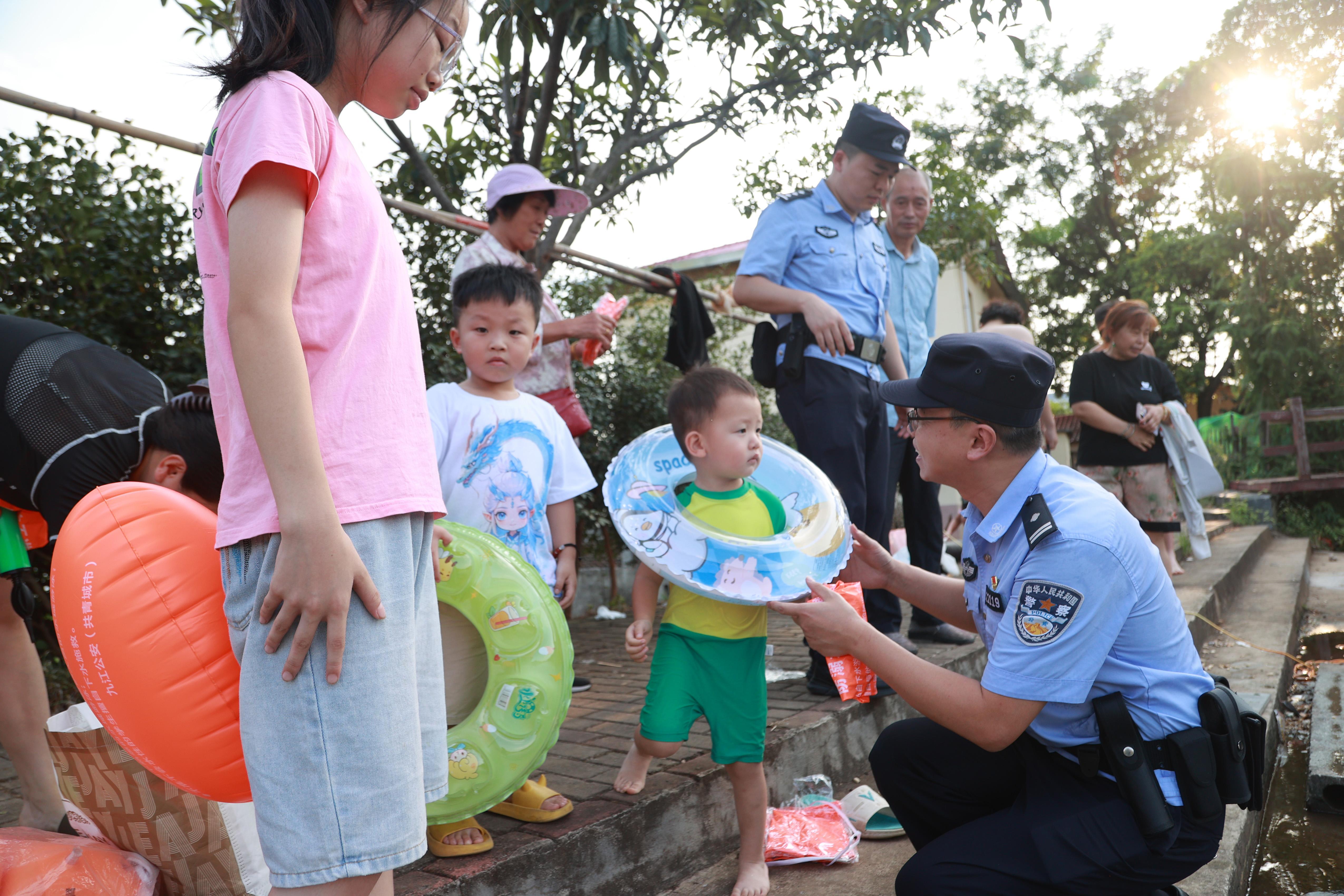 图为7月30日,民警在乡村池塘开展防溺水知识宣讲并向小朋友赠送救生浮袋。