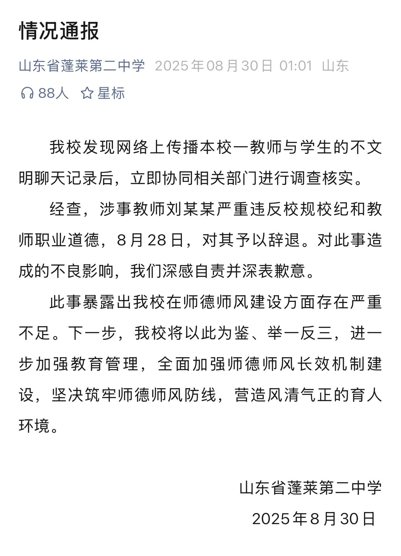 8月30日1点1分,山东省烟台市蓬莱第二中学通过官方微信公众号发布情况通报,对网传“教师与学生不文明聊天记录”事件进行回应,通报原文如下: