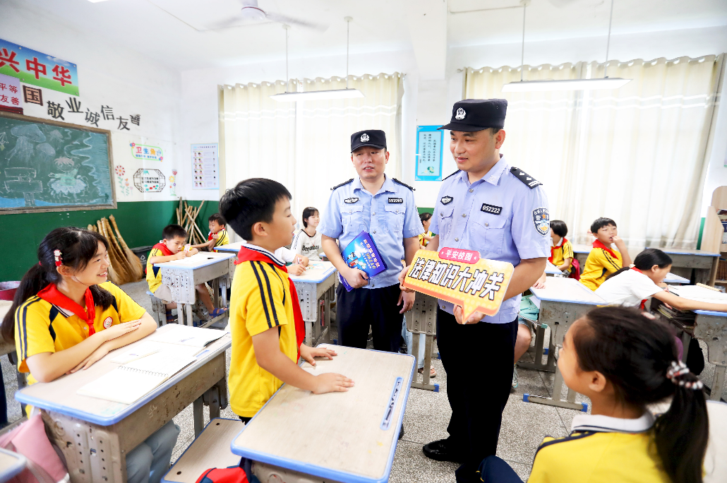 新学期伊始,江西省分宜县公安局组织民辅警走进辖区校园,开展“送法进校园 安全伴成长”普法宣传活动,通过案例讲解、游戏互动、趣味问答等方式,向同学们讲解防溺水、防校园欺凌、防火灾等安全知识,提升青少年的法律意识和自我保护能力。