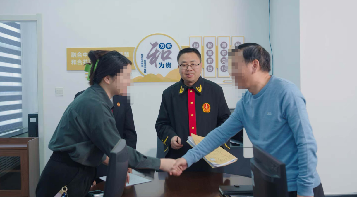 图为中国(新疆)自由贸易试验区乌鲁木齐片区法庭化解一起买卖合同纠纷,当事人双方握手言和。通讯员 王雅楠 摄