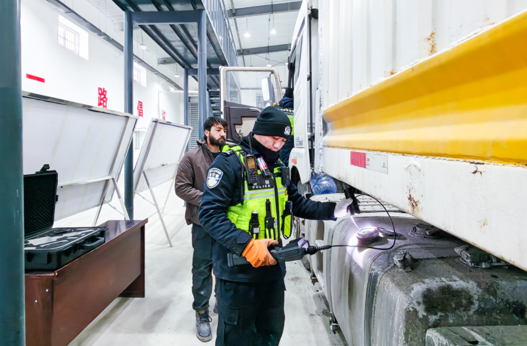 图为执勤民警在国门前查验出境货车并进行人证比对。