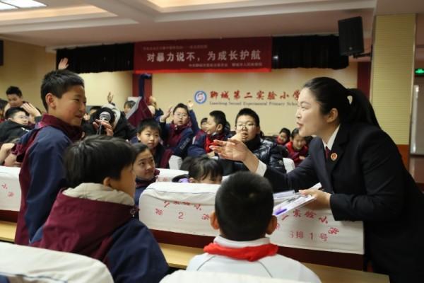 图为聊城市人民检察院检察官走进第二实验小学,进行“对暴力说不,为成长护航”有奖问答。