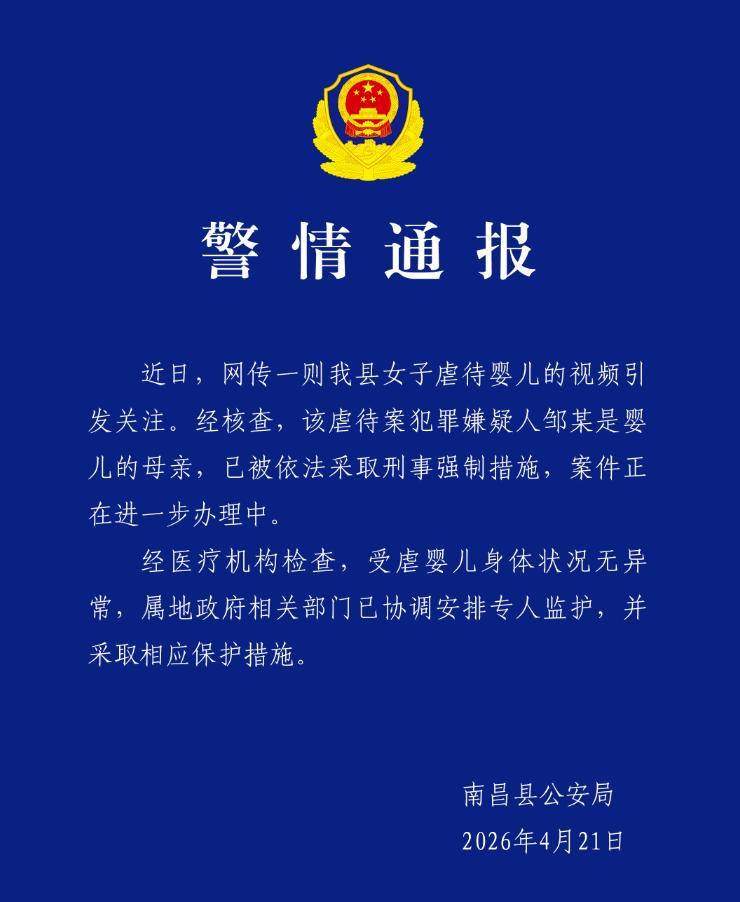 4月21日晚,江西省南昌县公安局发布警情通报,称网传虐待婴儿女子系其生母,已被依法采取刑事强制措施。