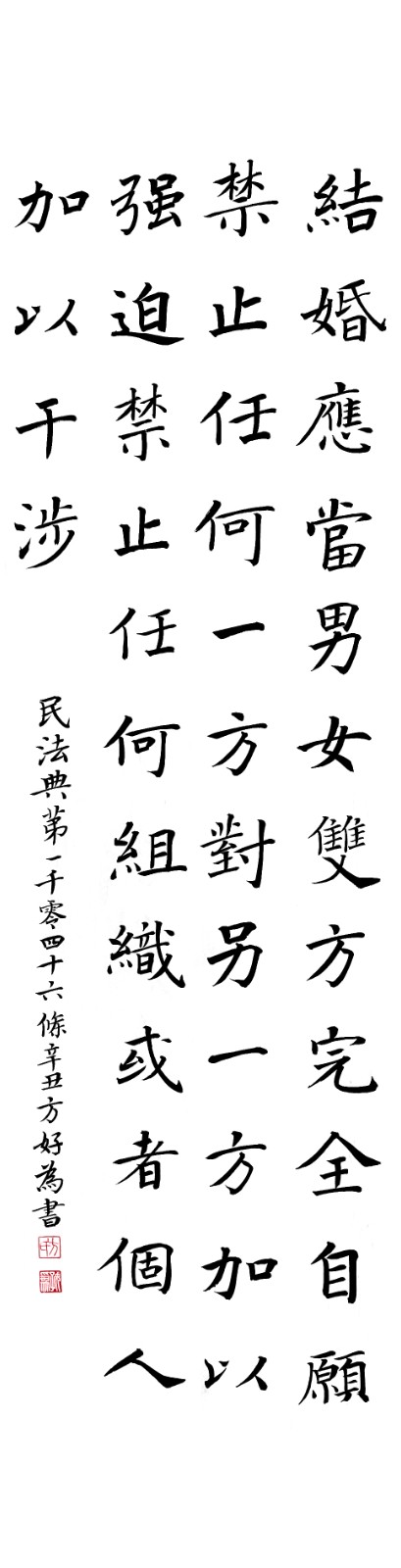 民法典第一千零四十六条 结婚应当男女双方完全自愿,禁止任何一方对另一方加以强迫,禁止任何组织或者个人加以干涉。