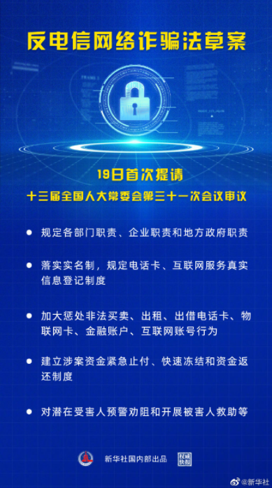 反电信网络诈骗法草案10月19日首次提请十三届全国人大常委会第三十一次会议审议。草案增强立法针对性、实用性、有效性,全面落实打防管控各项措施,规定反电信网络诈骗各部门职责、企业职责和地方政府职责;落实实名制,规定电话卡、互联网服务真实信息登记制度;加大惩处非法买卖、出租、出借电话卡、物联网卡、金融账户、互联网账号行为;建立涉案资金紧急止付、快速冻结和资金返还制度;对潜在受害人预警劝阻和开展被害人救助等。(记者熊丰,海报设计张晨光)