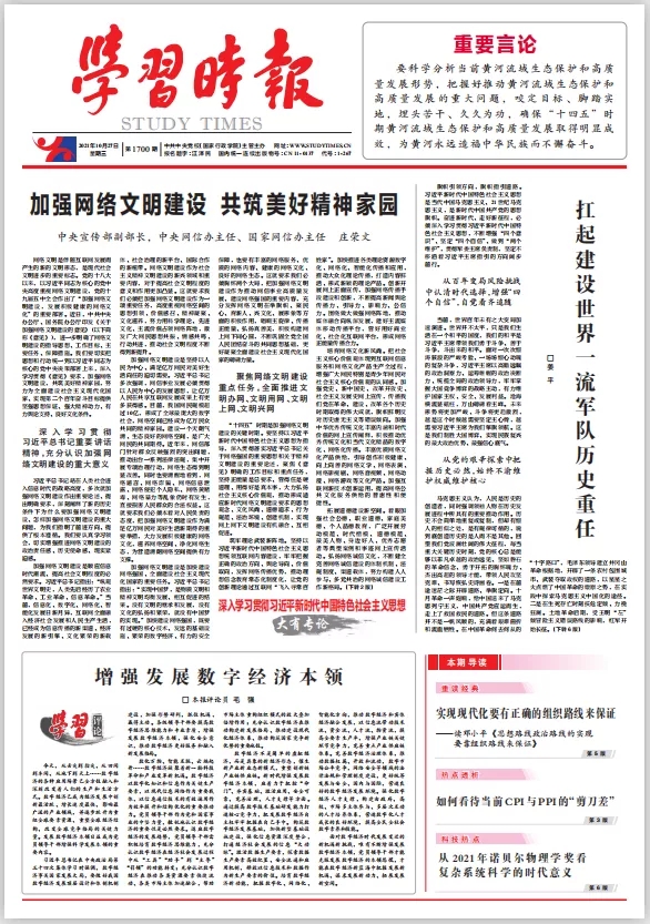 10月27日,中共中央党校《学习时报》在头版头条刊发中共中央宣传部副部长,中央网络安全和信息化委员会办公室主任、国家互联网信息办公室主任庄荣文署名文章。全文转发如下: