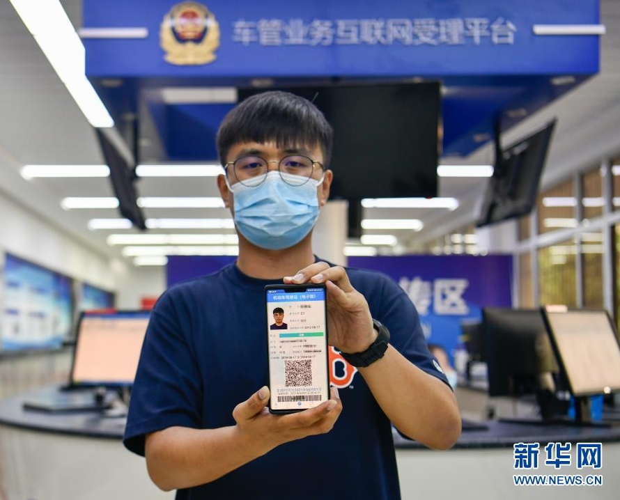6月1日,在天津市公安交通管理局车辆管理所,市民展示申领完成的机动车电子驾驶证。(新华社发)