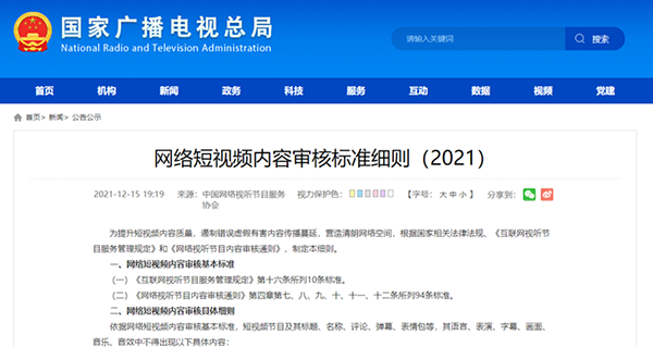 12月15日,中国网络视听节目服务协会发布《网络短视频内容审核标准细则》(2021)。 据悉,该协会组织有关短视频平台对2019版《细则》进行了全面修订,对原有21类100条标准进行了与时俱进的完善。