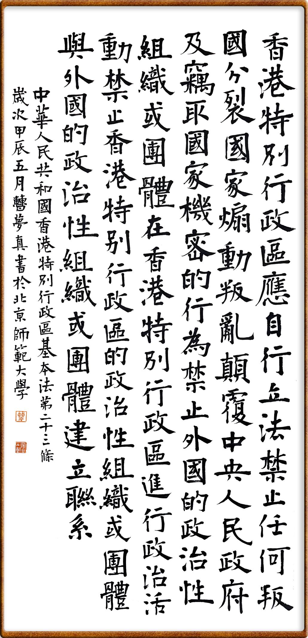 香港基本法第二十三条 香港特别行政区应自行立法禁止任何叛国、分裂国家、煽动叛乱、颠覆中央人民政府及窃取国家机密的行为,禁止外国的政治性组织或团体在香港特别行政区进行政治活动,禁止香港特别行政区的政治性组织或团体与外国的政治性组织或团体建立联系。