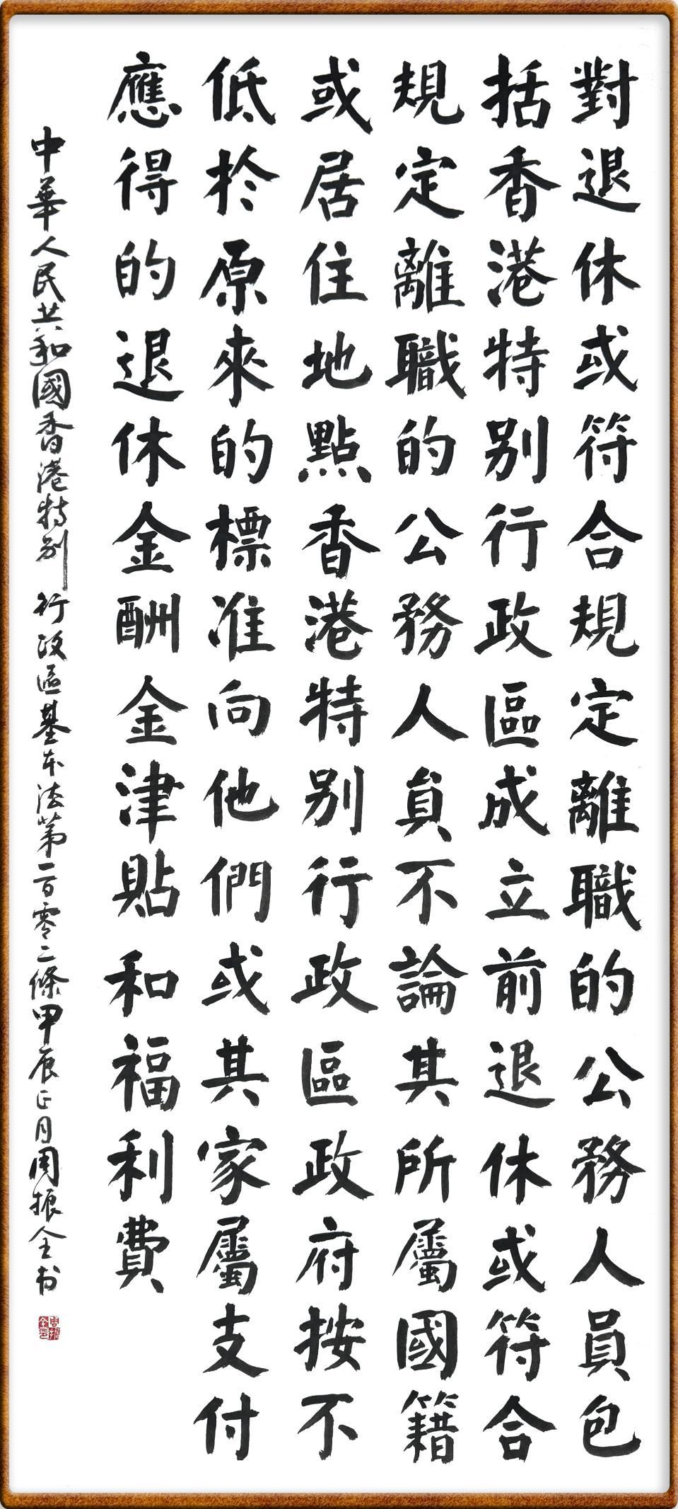 香港基本法第一百零二条 对退休或符合规定离职的公务人员,包括香港特别行政区成立前退休或符合规定离职的公务人员,不论其所属国籍或居住地点,香港特别行政区政府按不低于原来的标准向他们或其家属支付应得的退休金、酬金、津贴和福利费。