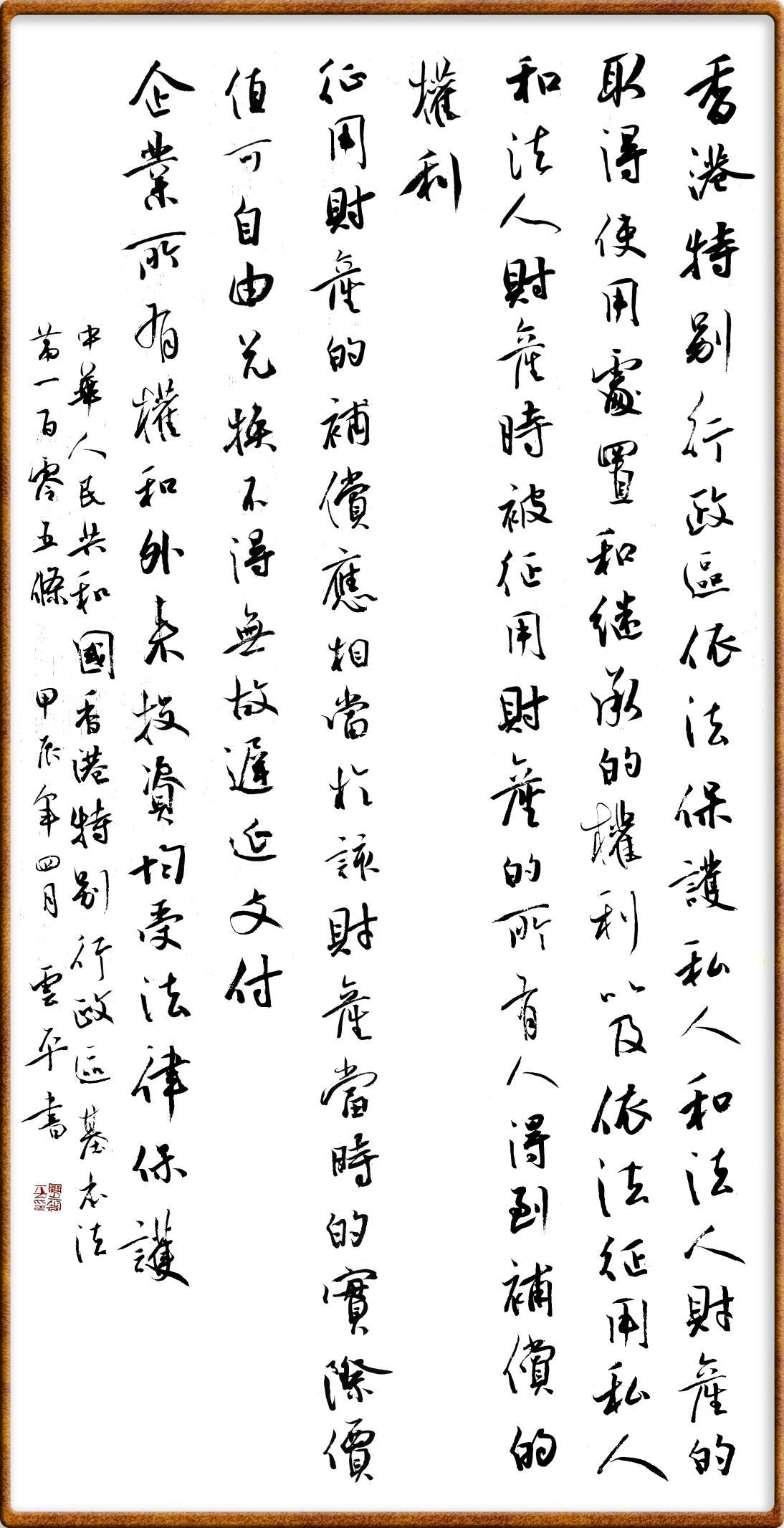 香港基本法第一百零五条 香港特别行政区依法保护私人和法人财产的取得、使用、处置和继承的权利,以及依法征用私人和法人财产时被征用财产的所有人得到补偿的权利。