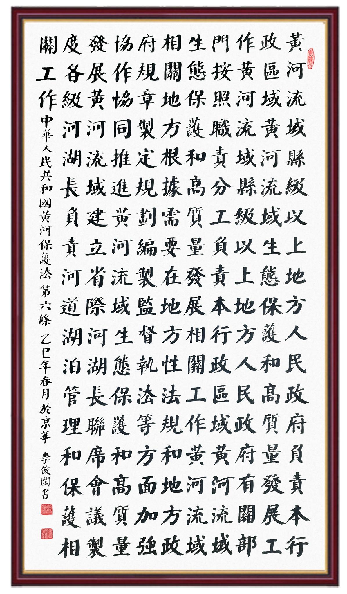 黄河宁,天下平。黄河是中华民族的发源地和摇篮,保护黄河是事关中华民族伟大复兴的千秋大计。《中华人民共和国黄河保护法》为推进水资源节约集约利用、保护传承弘扬黄河文化、推动黄河流域生态保护和高质量发展提供了有力法治保障。继书写《中华人民共和国民法典》《中华人民共和国宪法》《中华人民共和国澳门特别行政区基本法》《中华人民共和国香港特别行政区基本法》《中华人民共和国国旗法》《中华人民共和国国徽法》《中华人民共和国国歌法》《中华人民共和国法官法》等法律法规之后,法制日报社联合沿黄九省(区)司法厅、书法家协会,将笔端对准《中华人民共和国黄河保护法》。