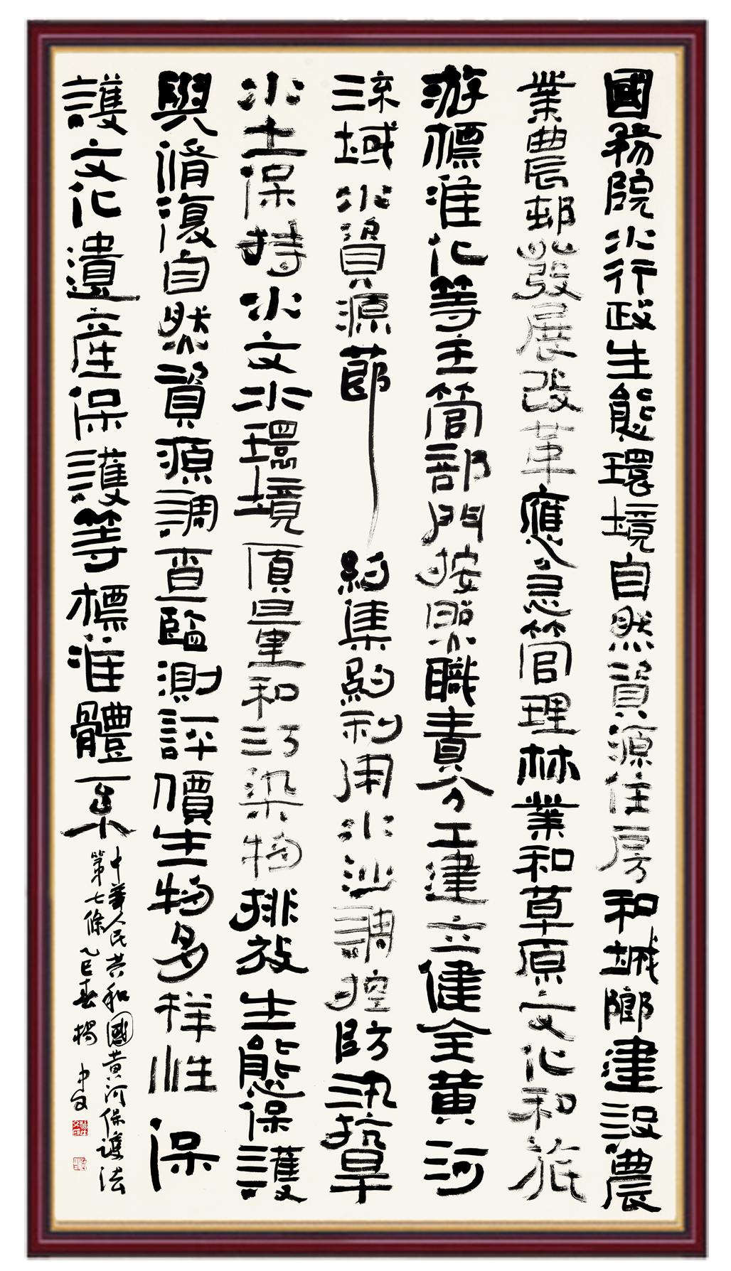 黄河宁,天下平。黄河是中华民族的发源地和摇篮,保护黄河是事关中华民族伟大复兴的千秋大计。《中华人民共和国黄河保护法》为推进水资源节约集约利用、保护传承弘扬黄河文化、推动黄河流域生态保护和高质量发展提供了有力法治保障。继书写《中华人民共和国民法典》《中华人民共和国宪法》《中华人民共和国澳门特别行政区基本法》《中华人民共和国香港特别行政区基本法》《中华人民共和国国旗法》《中华人民共和国国徽法》《中华人民共和国国歌法》《中华人民共和国法官法》等法律法规之后,法制日报社联合沿黄九省(区)司法厅、书法家协会,将笔端对准《中华人民共和国黄河保护法》。