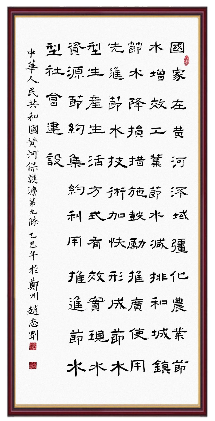 黄河宁,天下平。黄河是中华民族的发源地和摇篮,保护黄河是事关中华民族伟大复兴的千秋大计。《中华人民共和国黄河保护法》为推进水资源节约集约利用、保护传承弘扬黄河文化、推动黄河流域生态保护和高质量发展提供了有力法治保障。继书写《中华人民共和国民法典》《中华人民共和国宪法》《中华人民共和国澳门特别行政区基本法》《中华人民共和国香港特别行政区基本法》《中华人民共和国国旗法》《中华人民共和国国徽法》《中华人民共和国国歌法》《中华人民共和国法官法》等法律法规之后,法制日报社联合沿黄九省(区)司法厅、书法家协会,将笔端对准《中华人民共和国黄河保护法》。