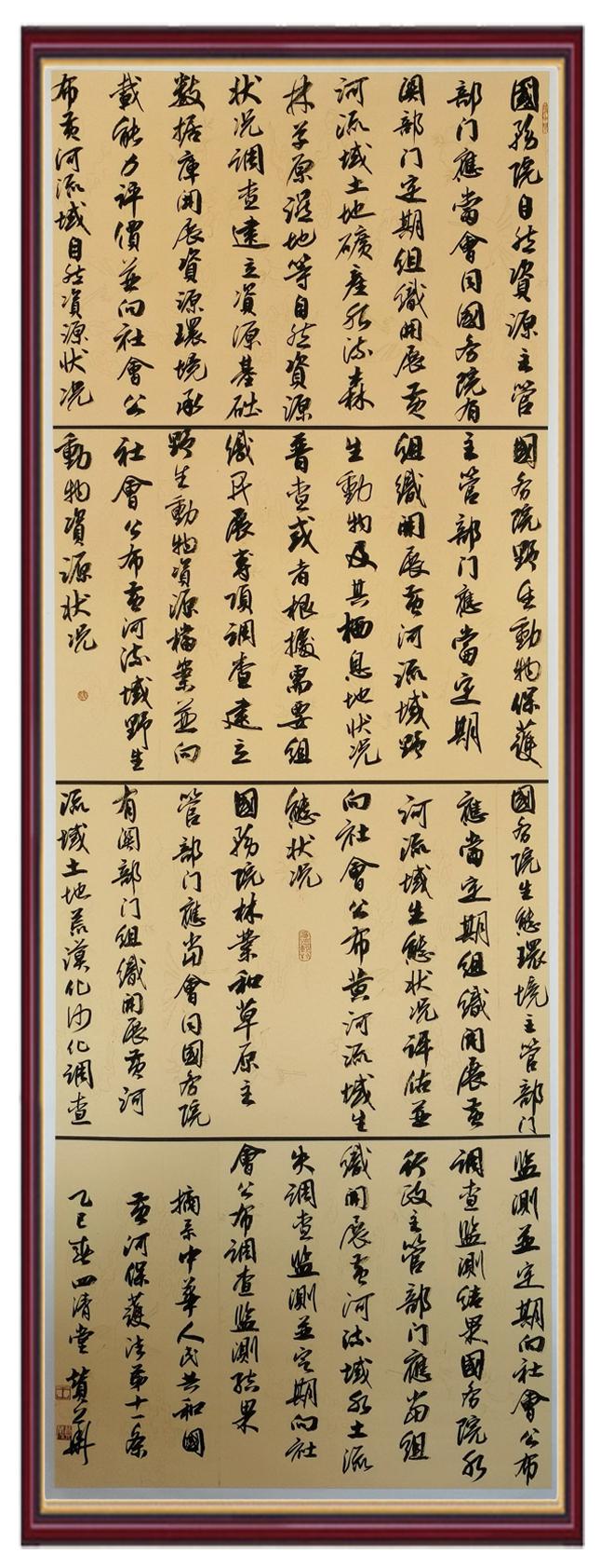 黄河宁,天下平。黄河是中华民族的发源地和摇篮,保护黄河是事关中华民族伟大复兴的千秋大计。《中华人民共和国黄河保护法》为推进水资源节约集约利用、保护传承弘扬黄河文化、推动黄河流域生态保护和高质量发展提供了有力法治保障。继书写《中华人民共和国民法典》《中华人民共和国宪法》《中华人民共和国澳门特别行政区基本法》《中华人民共和国香港特别行政区基本法》《中华人民共和国国旗法》《中华人民共和国国徽法》《中华人民共和国国歌法》《中华人民共和国法官法》等法律法规之后,法制日报社联合沿黄九省(区)司法厅、书法家协会,将笔端对准《中华人民共和国黄河保护法》。