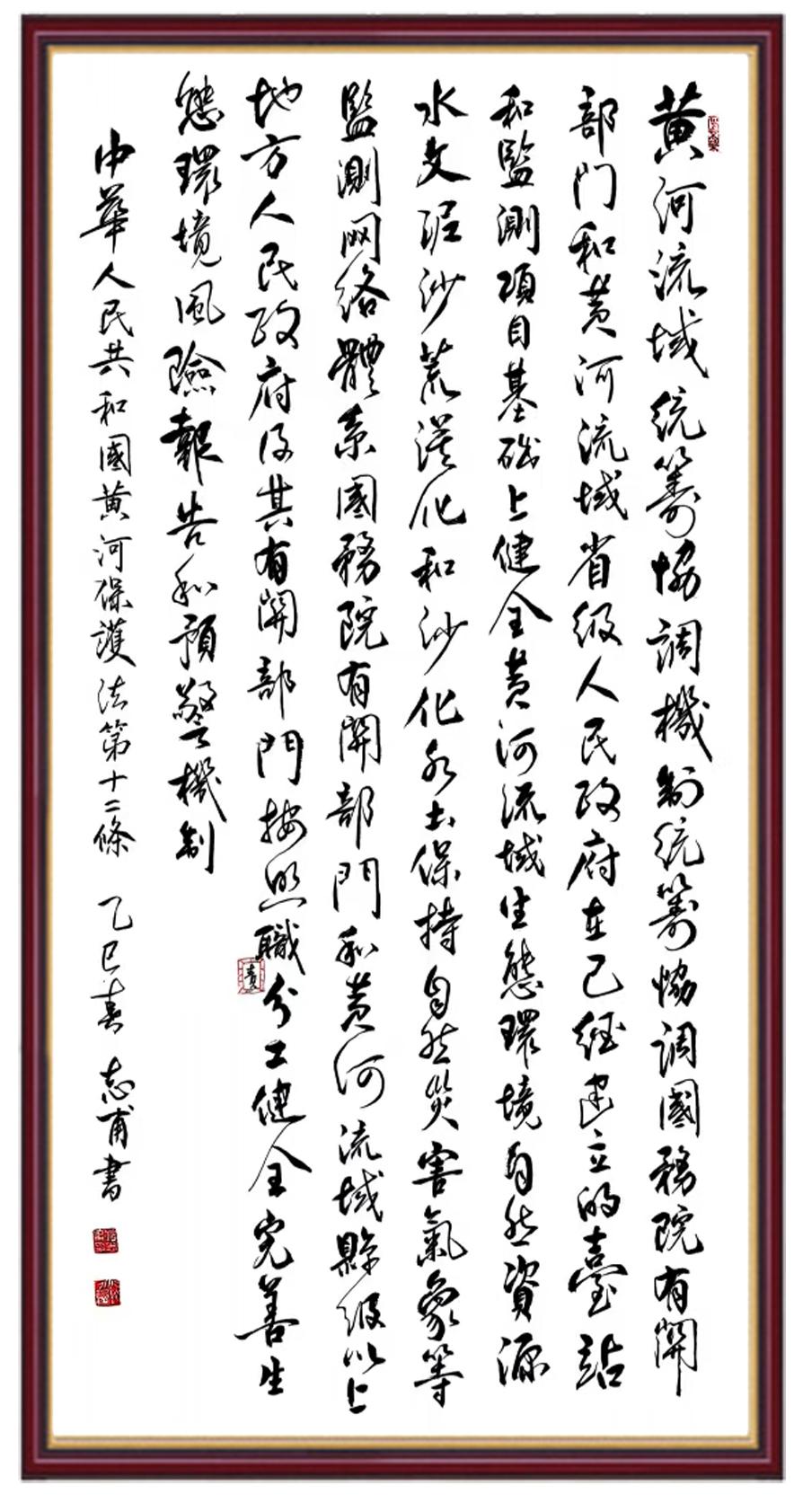 黄河宁,天下平。黄河是中华民族的发源地和摇篮,保护黄河是事关中华民族伟大复兴的千秋大计。《中华人民共和国黄河保护法》为推进水资源节约集约利用、保护传承弘扬黄河文化、推动黄河流域生态保护和高质量发展提供了有力法治保障。继书写《中华人民共和国民法典》《中华人民共和国宪法》《中华人民共和国澳门特别行政区基本法》《中华人民共和国香港特别行政区基本法》《中华人民共和国国旗法》《中华人民共和国国徽法》《中华人民共和国国歌法》《中华人民共和国法官法》等法律法规之后,法制日报社联合沿黄九省(区)司法厅、书法家协会,将笔端对准《中华人民共和国黄河保护法》。