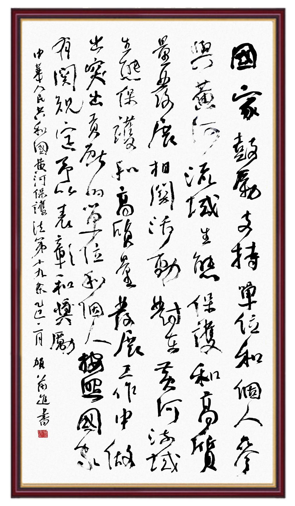 黄河宁,天下平。黄河是中华民族的发源地和摇篮,保护黄河是事关中华民族伟大复兴的千秋大计。《中华人民共和国黄河保护法》为推进水资源节约集约利用、保护传承弘扬黄河文化、推动黄河流域生态保护和高质量发展提供了有力法治保障。继书写《中华人民共和国民法典》《中华人民共和国宪法》《中华人民共和国澳门特别行政区基本法》《中华人民共和国香港特别行政区基本法》《中华人民共和国国旗法》《中华人民共和国国徽法》《中华人民共和国国歌法》《中华人民共和国法官法》等法律法规之后,法制日报社联合沿黄九省(区)司法厅、书法家协会,将笔端对准《中华人民共和国黄河保护法》。