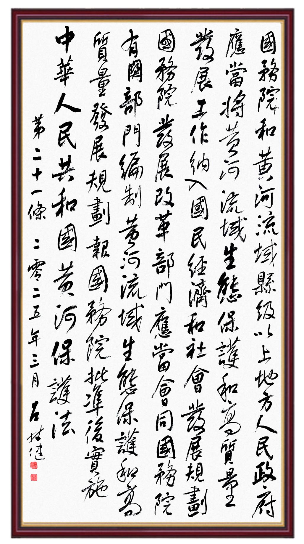 黄河宁,天下平。黄河是中华民族的发源地和摇篮,保护黄河是事关中华民族伟大复兴的千秋大计。《中华人民共和国黄河保护法》为推进水资源节约集约利用、保护传承弘扬黄河文化、推动黄河流域生态保护和高质量发展提供了有力法治保障。继书写《中华人民共和国民法典》《中华人民共和国宪法》《中华人民共和国澳门特别行政区基本法》《中华人民共和国香港特别行政区基本法》《中华人民共和国国旗法》《中华人民共和国国徽法》《中华人民共和国国歌法》《中华人民共和国法官法》等法律法规之后,法制日报社联合沿黄九省(区)司法厅、书法家协会,将笔端对准《中华人民共和国黄河保护法》。