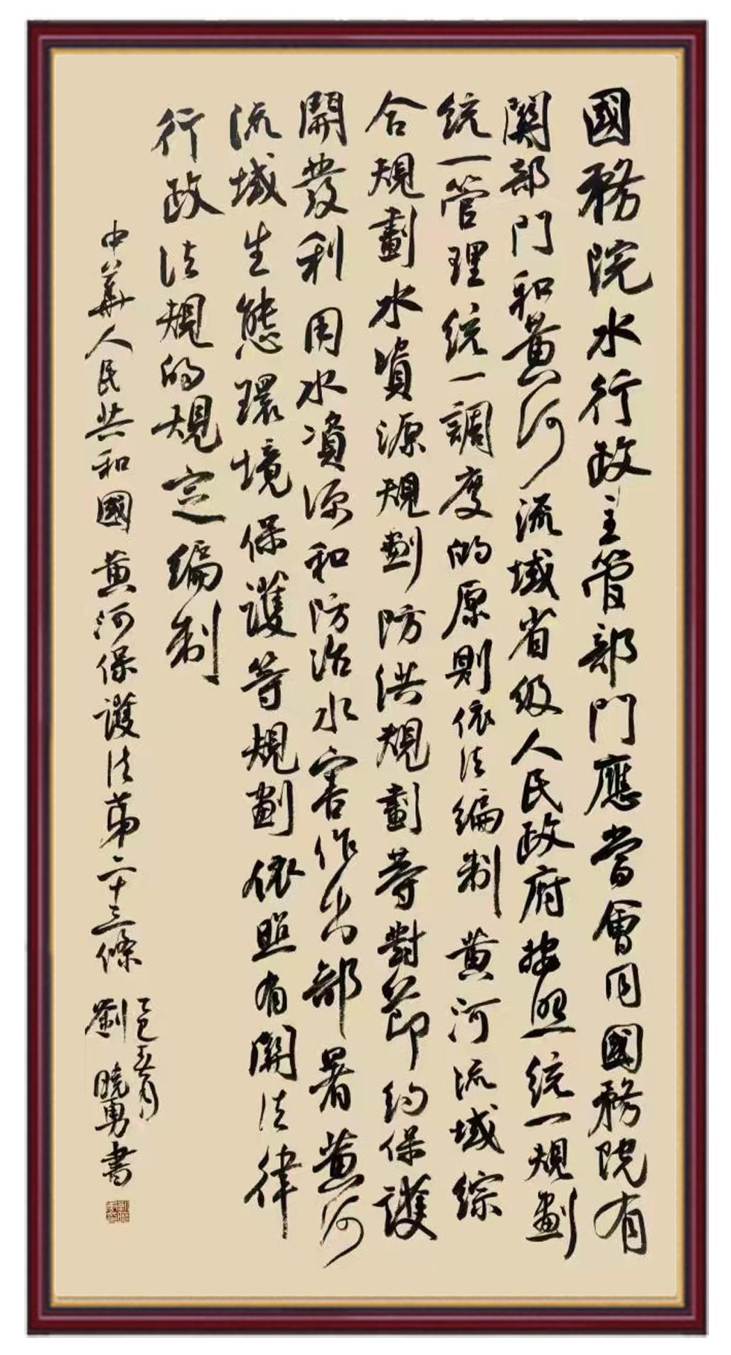 黄河宁,天下平。黄河是中华民族的发源地和摇篮,保护黄河是事关中华民族伟大复兴的千秋大计。《中华人民共和国黄河保护法》为推进水资源节约集约利用、保护传承弘扬黄河文化、推动黄河流域生态保护和高质量发展提供了有力法治保障。继书写《中华人民共和国民法典》《中华人民共和国宪法》《中华人民共和国澳门特别行政区基本法》《中华人民共和国香港特别行政区基本法》《中华人民共和国国旗法》《中华人民共和国国徽法》《中华人民共和国国歌法》《中华人民共和国法官法》等法律法规之后,法制日报社联合沿黄九省(区)司法厅、书法家协会,将笔端对准《中华人民共和国黄河保护法》。