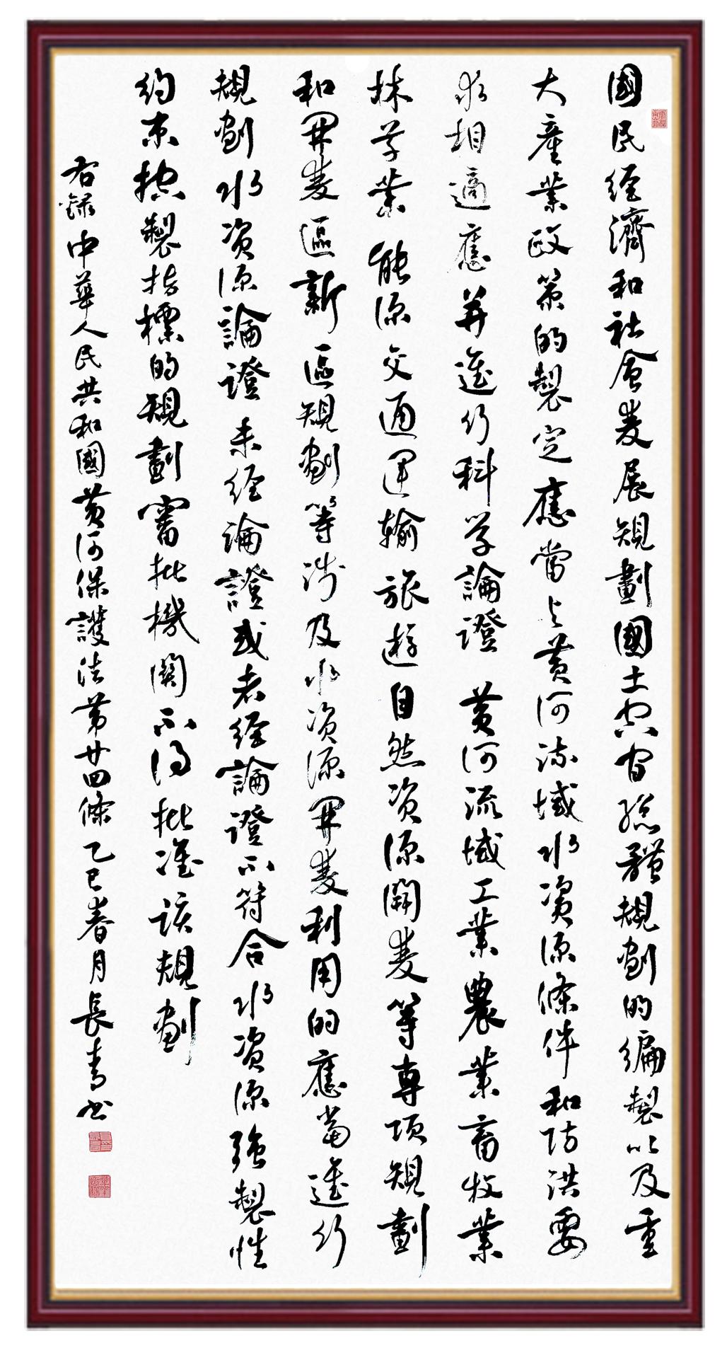 黄河宁,天下平。黄河是中华民族的发源地和摇篮,保护黄河是事关中华民族伟大复兴的千秋大计。《中华人民共和国黄河保护法》为推进水资源节约集约利用、保护传承弘扬黄河文化、推动黄河流域生态保护和高质量发展提供了有力法治保障。继书写《中华人民共和国民法典》《中华人民共和国宪法》《中华人民共和国澳门特别行政区基本法》《中华人民共和国香港特别行政区基本法》《中华人民共和国国旗法》《中华人民共和国国徽法》《中华人民共和国国歌法》《中华人民共和国法官法》等法律法规之后,法制日报社联合沿黄九省(区)司法厅、书法家协会,将笔端对准《中华人民共和国黄河保护法》。