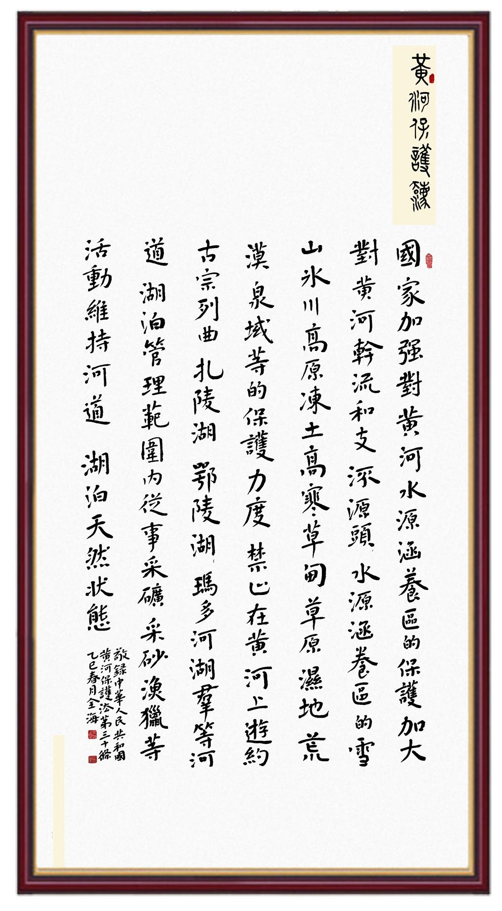 黄河宁,天下平。黄河是中华民族的发源地和摇篮,保护黄河是事关中华民族伟大复兴的千秋大计。《中华人民共和国黄河保护法》为推进水资源节约集约利用、保护传承弘扬黄河文化、推动黄河流域生态保护和高质量发展提供了有力法治保障。继书写《中华人民共和国民法典》《中华人民共和国宪法》《中华人民共和国澳门特别行政区基本法》《中华人民共和国香港特别行政区基本法》《中华人民共和国国旗法》《中华人民共和国国徽法》《中华人民共和国国歌法》《中华人民共和国法官法》等法律法规之后,法制日报社联合沿黄九省(区)司法厅、书法家协会,将笔端对准《中华人民共和国黄河保护法》。