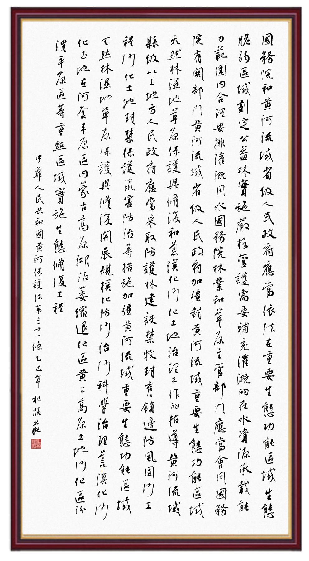 黄河宁,天下平。黄河是中华民族的发源地和摇篮,保护黄河是事关中华民族伟大复兴的千秋大计。《中华人民共和国黄河保护法》为推进水资源节约集约利用、保护传承弘扬黄河文化、推动黄河流域生态保护和高质量发展提供了有力法治保障。继书写《中华人民共和国民法典》《中华人民共和国宪法》《中华人民共和国澳门特别行政区基本法》《中华人民共和国香港特别行政区基本法》《中华人民共和国国旗法》《中华人民共和国国徽法》《中华人民共和国国歌法》《中华人民共和国法官法》等法律法规之后,法制日报社联合沿黄九省(区)司法厅、书法家协会,将笔端对准《中华人民共和国黄河保护法》。