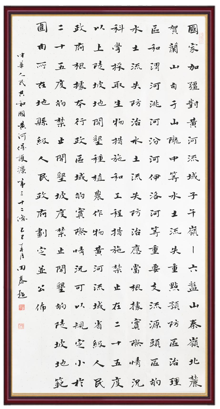黄河宁,天下平。黄河是中华民族的发源地和摇篮,保护黄河是事关中华民族伟大复兴的千秋大计。《中华人民共和国黄河保护法》为推进水资源节约集约利用、保护传承弘扬黄河文化、推动黄河流域生态保护和高质量发展提供了有力法治保障。继书写《中华人民共和国民法典》《中华人民共和国宪法》《中华人民共和国澳门特别行政区基本法》《中华人民共和国香港特别行政区基本法》《中华人民共和国国旗法》《中华人民共和国国徽法》《中华人民共和国国歌法》《中华人民共和国法官法》等法律法规之后,法制日报社联合沿黄九省(区)司法厅、书法家协会,将笔端对准《中华人民共和国黄河保护法》。
