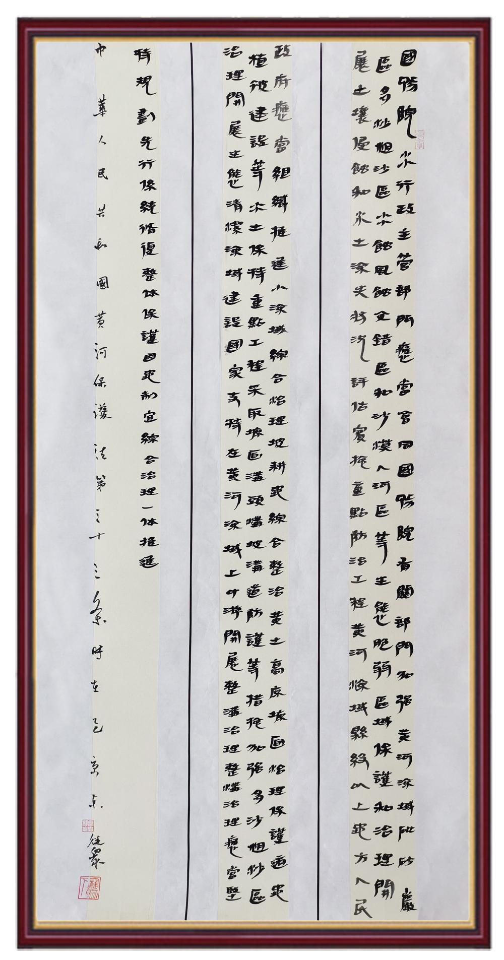 黄河宁,天下平。黄河是中华民族的发源地和摇篮,保护黄河是事关中华民族伟大复兴的千秋大计。《中华人民共和国黄河保护法》为推进水资源节约集约利用、保护传承弘扬黄河文化、推动黄河流域生态保护和高质量发展提供了有力法治保障。继书写《中华人民共和国民法典》《中华人民共和国宪法》《中华人民共和国澳门特别行政区基本法》《中华人民共和国香港特别行政区基本法》《中华人民共和国国旗法》《中华人民共和国国徽法》《中华人民共和国国歌法》《中华人民共和国法官法》等法律法规之后,法制日报社联合沿黄九省(区)司法厅、书法家协会,将笔端对准《中华人民共和国黄河保护法》。