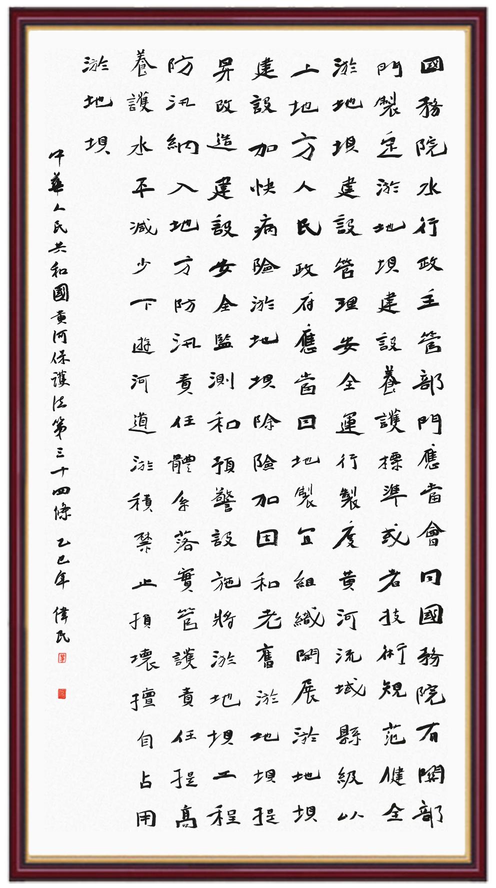 黄河宁,天下平。黄河是中华民族的发源地和摇篮,保护黄河是事关中华民族伟大复兴的千秋大计。《中华人民共和国黄河保护法》为推进水资源节约集约利用、保护传承弘扬黄河文化、推动黄河流域生态保护和高质量发展提供了有力法治保障。继书写《中华人民共和国民法典》《中华人民共和国宪法》《中华人民共和国澳门特别行政区基本法》《中华人民共和国香港特别行政区基本法》《中华人民共和国国旗法》《中华人民共和国国徽法》《中华人民共和国国歌法》《中华人民共和国法官法》等法律法规之后,法制日报社联合沿黄九省(区)司法厅、书法家协会,将笔端对准《中华人民共和国黄河保护法》。