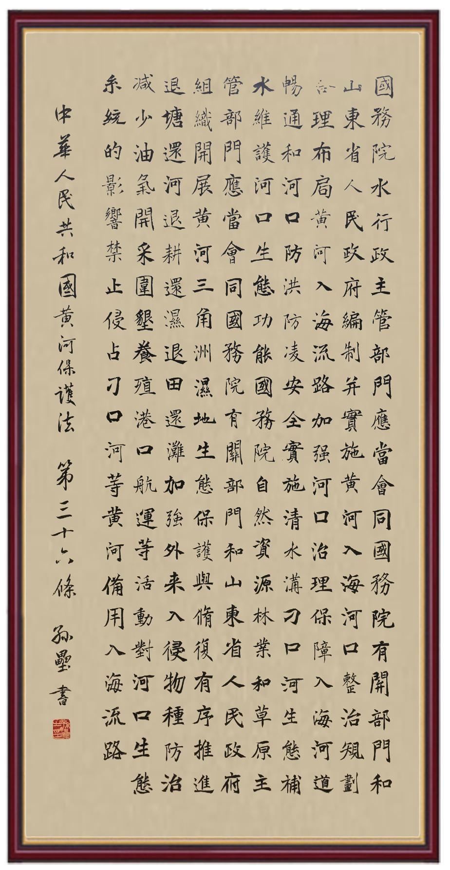 黄河宁,天下平。黄河是中华民族的发源地和摇篮,保护黄河是事关中华民族伟大复兴的千秋大计。《中华人民共和国黄河保护法》为推进水资源节约集约利用、保护传承弘扬黄河文化、推动黄河流域生态保护和高质量发展提供了有力法治保障。继书写《中华人民共和国民法典》《中华人民共和国宪法》《中华人民共和国澳门特别行政区基本法》《中华人民共和国香港特别行政区基本法》《中华人民共和国国旗法》《中华人民共和国国徽法》《中华人民共和国国歌法》《中华人民共和国法官法》等法律法规之后,法制日报社联合沿黄九省(区)司法厅、书法家协会,将笔端对准《中华人民共和国黄河保护法》。