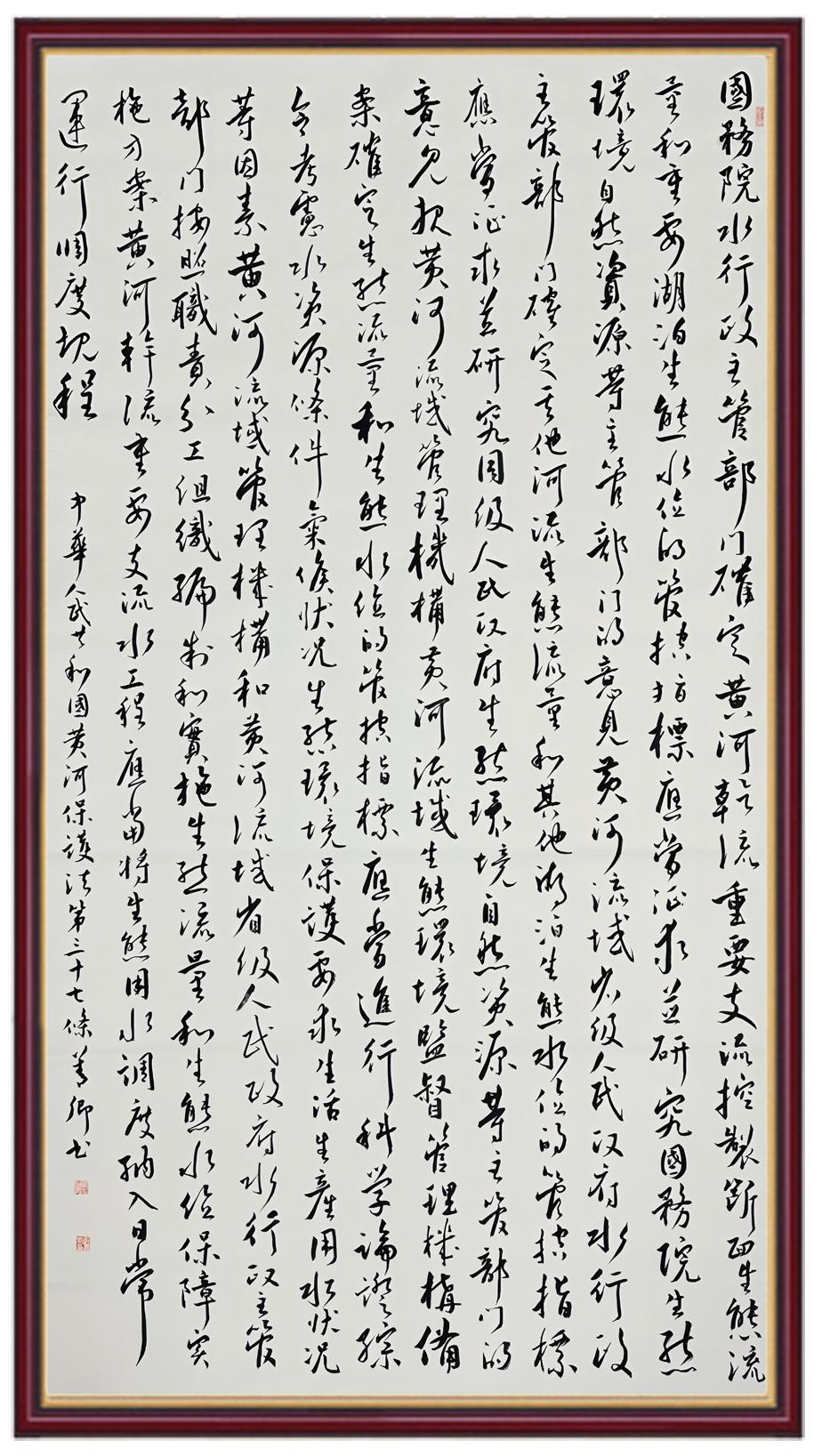 黄河宁,天下平。黄河是中华民族的发源地和摇篮,保护黄河是事关中华民族伟大复兴的千秋大计。《中华人民共和国黄河保护法》为推进水资源节约集约利用、保护传承弘扬黄河文化、推动黄河流域生态保护和高质量发展提供了有力法治保障。继书写《中华人民共和国民法典》《中华人民共和国宪法》《中华人民共和国澳门特别行政区基本法》《中华人民共和国香港特别行政区基本法》《中华人民共和国国旗法》《中华人民共和国国徽法》《中华人民共和国国歌法》《中华人民共和国法官法》等法律法规之后,法制日报社联合沿黄九省(区)司法厅、书法家协会,将笔端对准《中华人民共和国黄河保护法》。