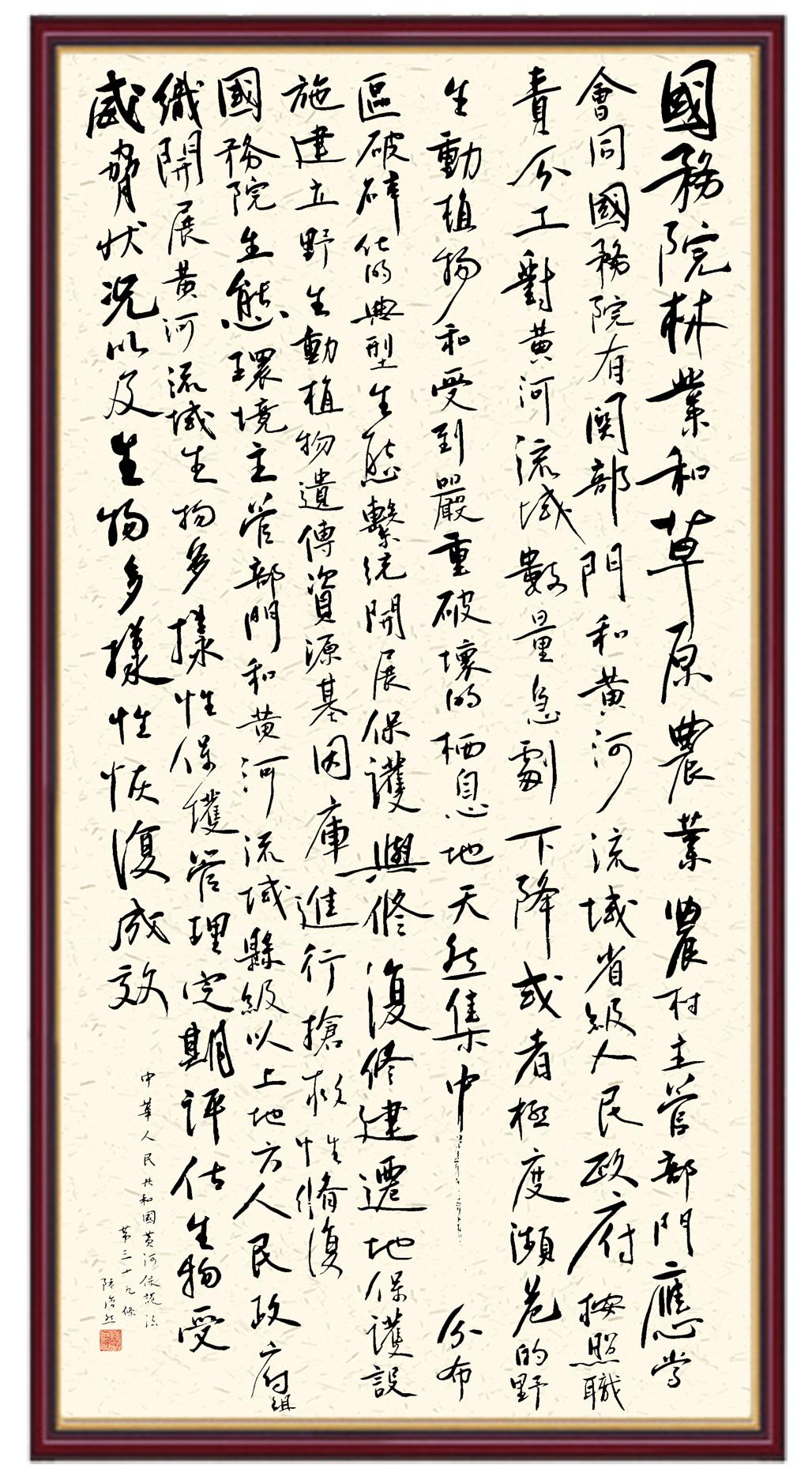 黄河宁,天下平。黄河是中华民族的发源地和摇篮,保护黄河是事关中华民族伟大复兴的千秋大计。《中华人民共和国黄河保护法》为推进水资源节约集约利用、保护传承弘扬黄河文化、推动黄河流域生态保护和高质量发展提供了有力法治保障。继书写《中华人民共和国民法典》《中华人民共和国宪法》《中华人民共和国澳门特别行政区基本法》《中华人民共和国香港特别行政区基本法》《中华人民共和国国旗法》《中华人民共和国国徽法》《中华人民共和国国歌法》《中华人民共和国法官法》等法律法规之后,法制日报社联合沿黄九省(区)司法厅、书法家协会,将笔端对准《中华人民共和国黄河保护法》。